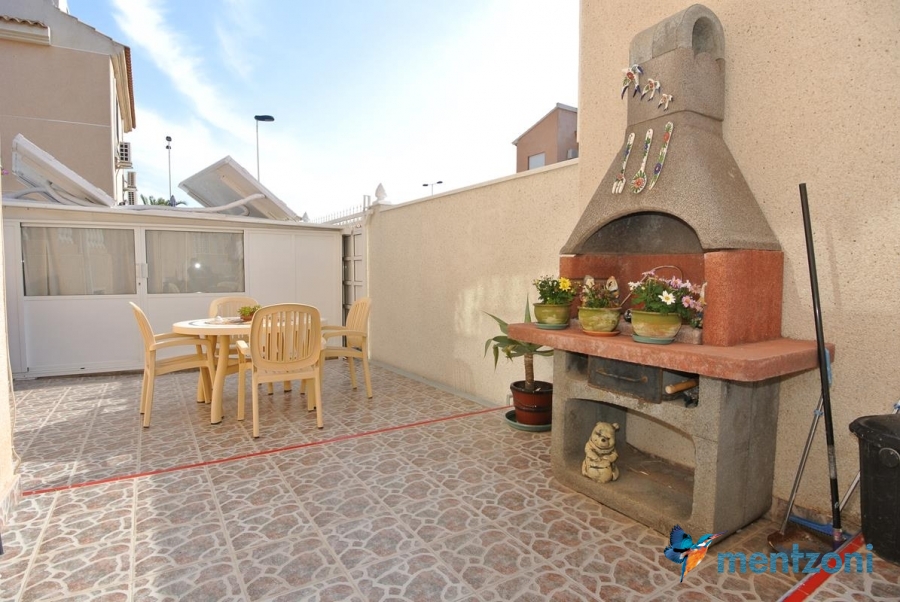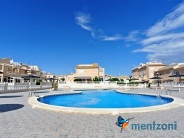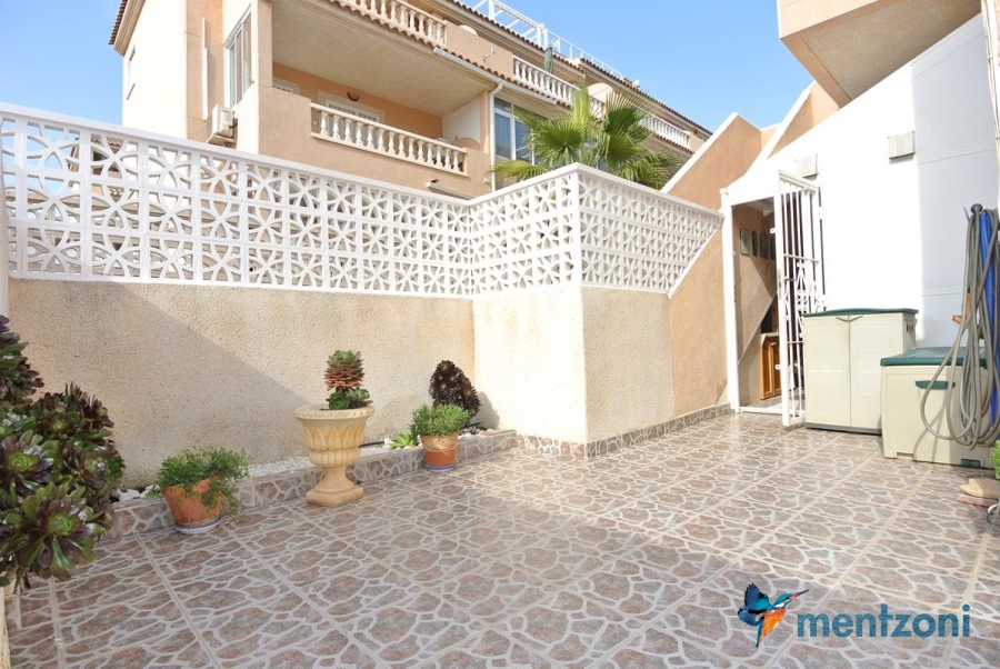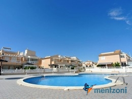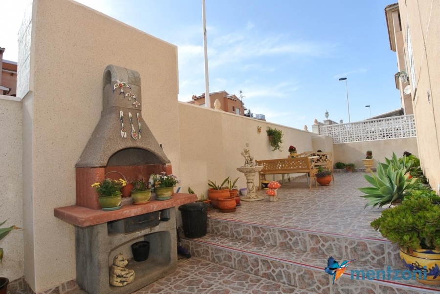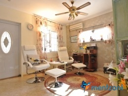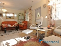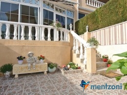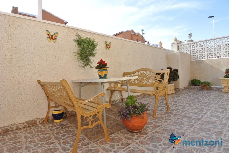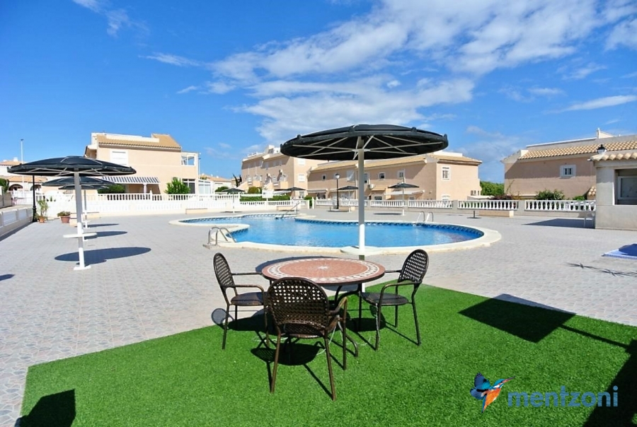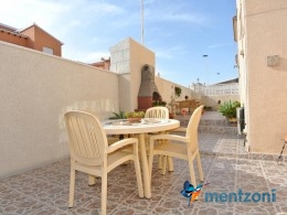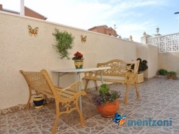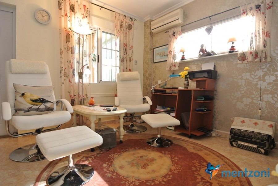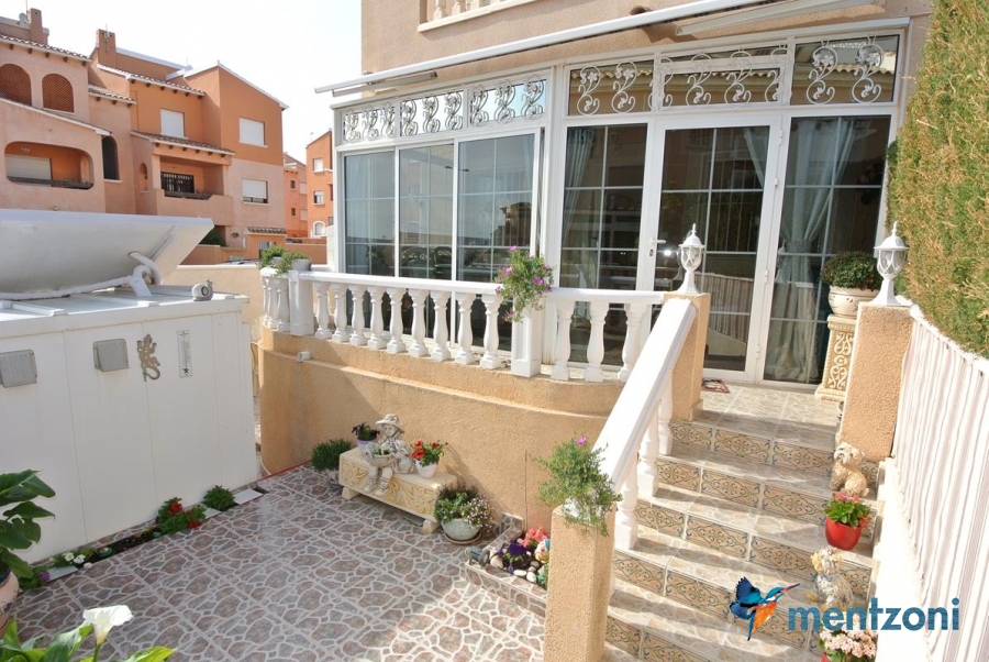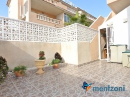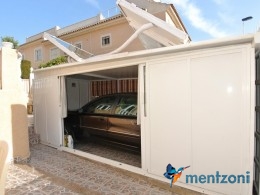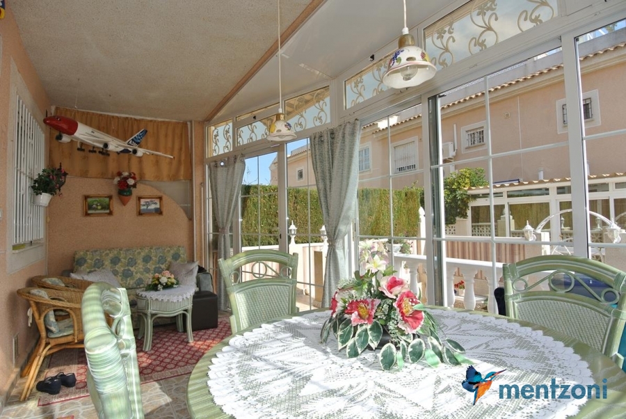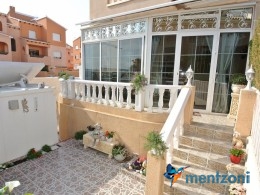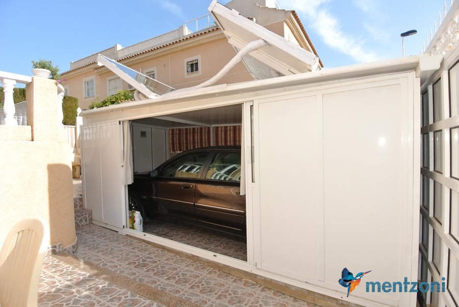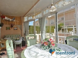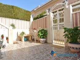 Bonito bungalow en planta baja, con gran jardín al sur con mucho sol. Aquí actual hay un garaje de aluminio. La terraza en la entrada esta acristalada.