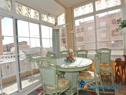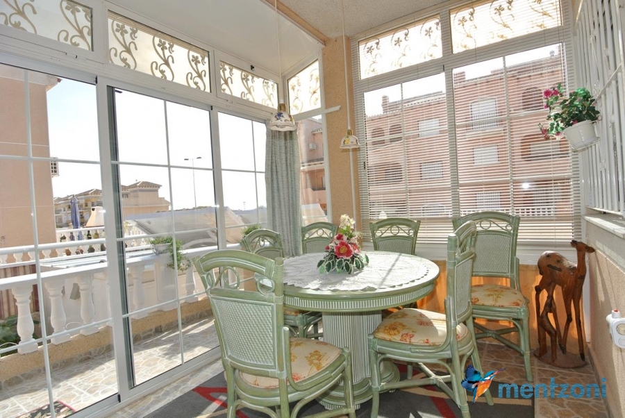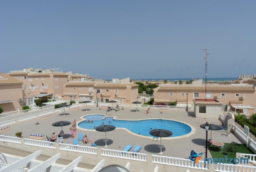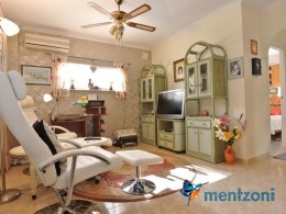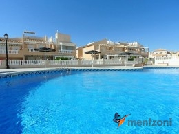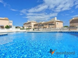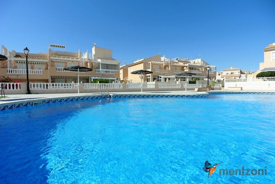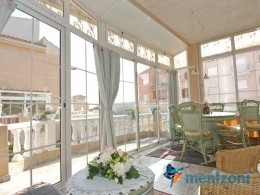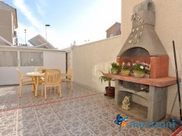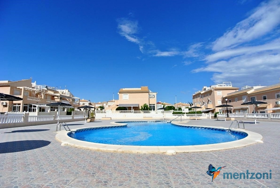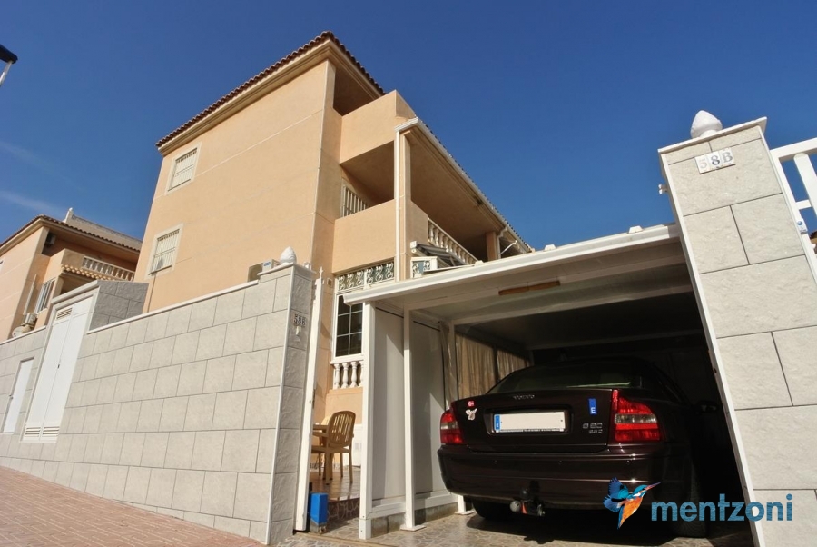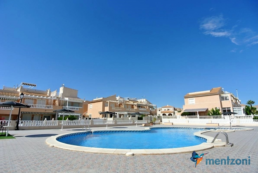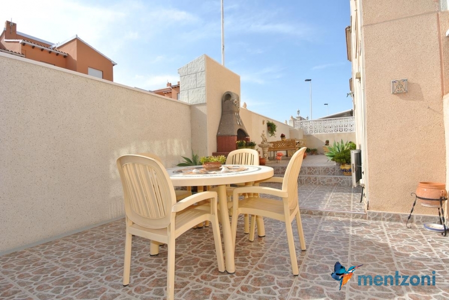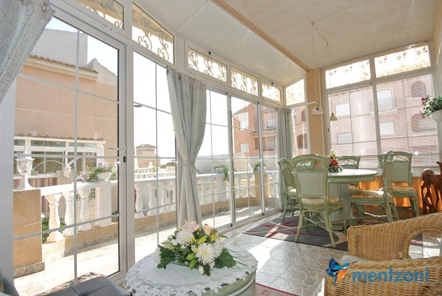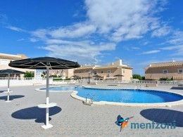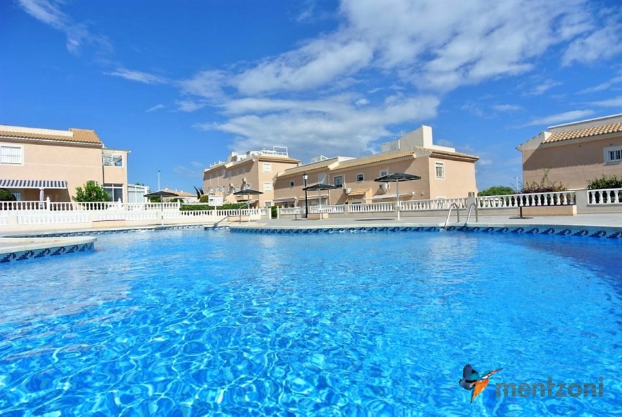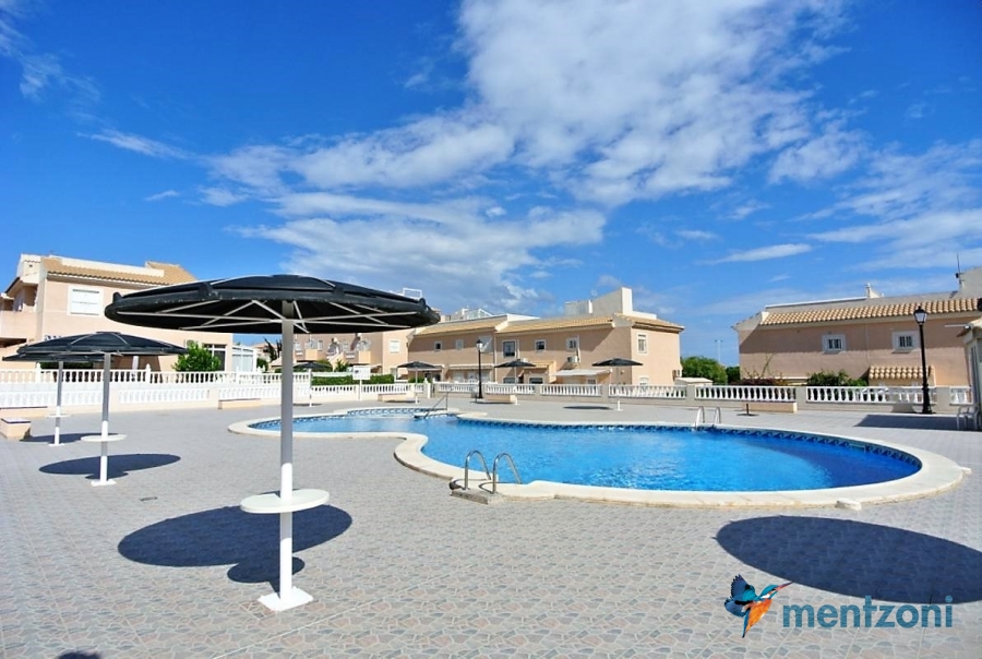 Bonito bungalow en planta baja, con gran jardín al sur con mucho sol. Aquí actual hay un garaje de aluminio. La terraza en la entrada esta acristalada.
