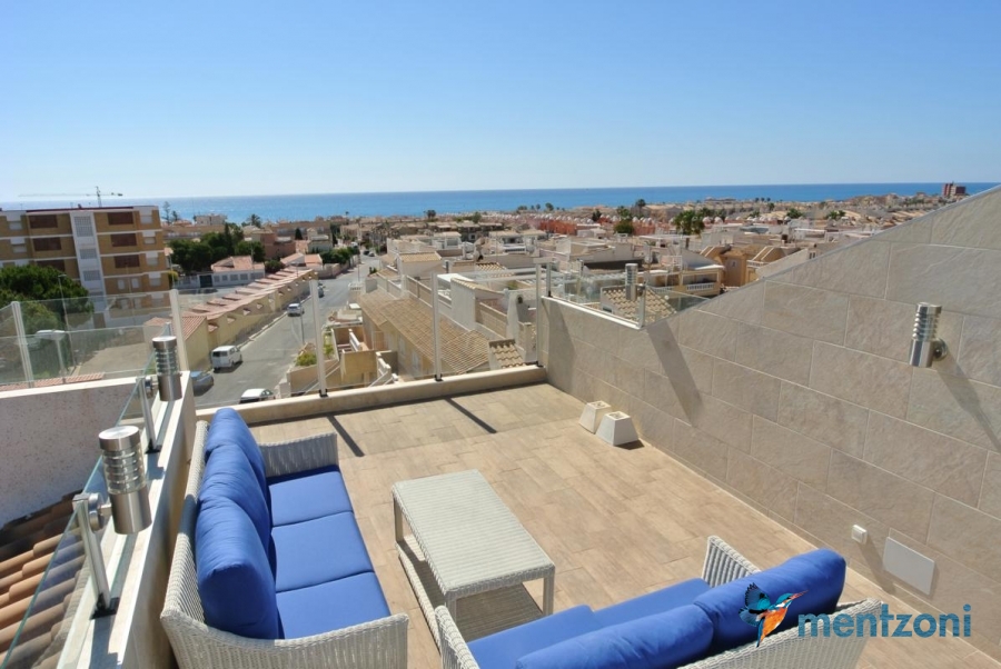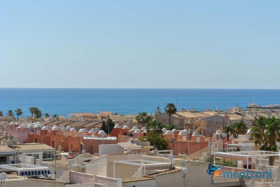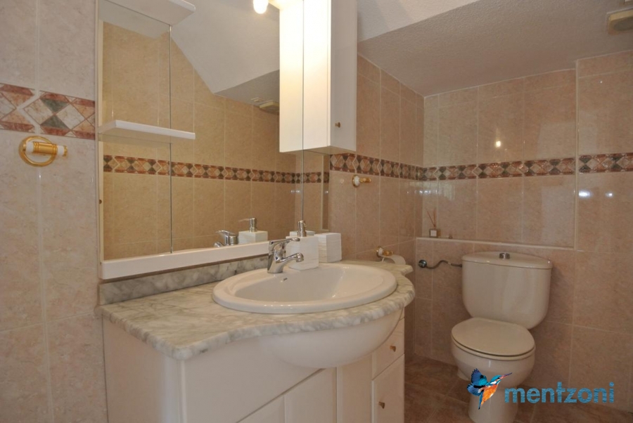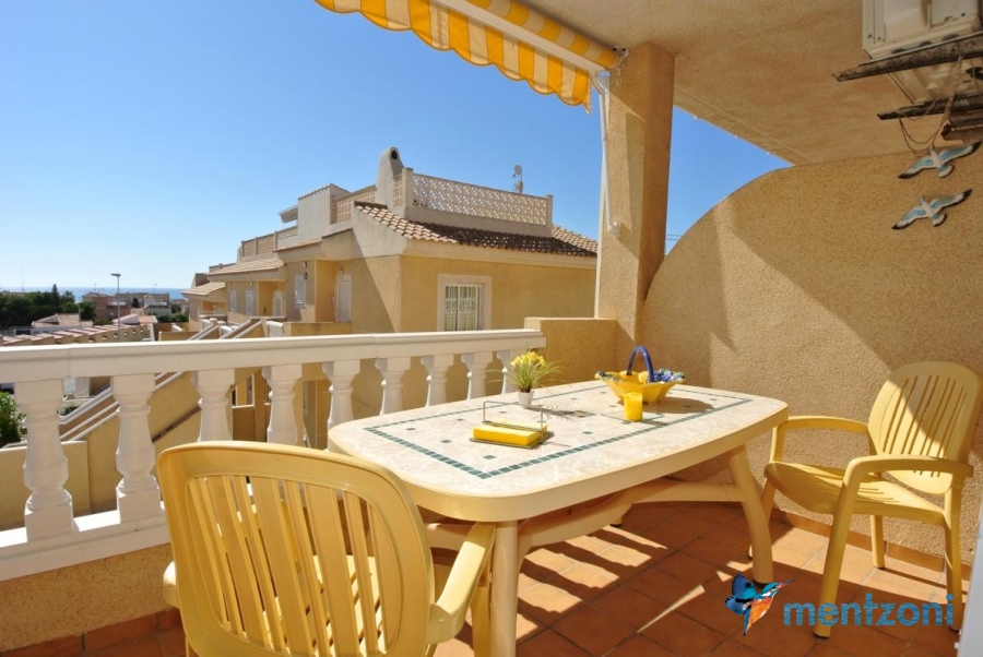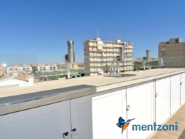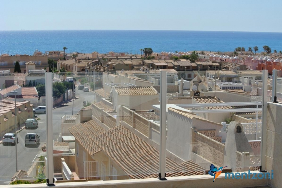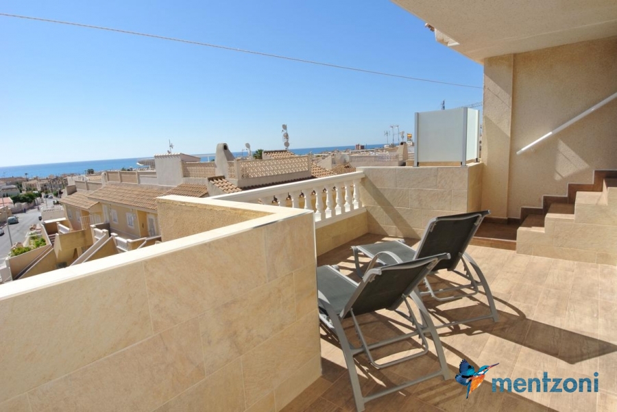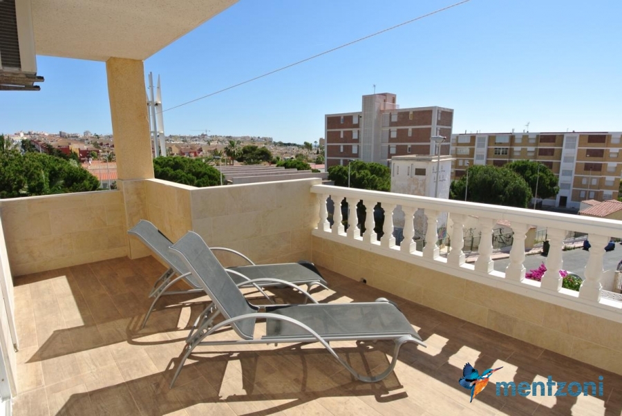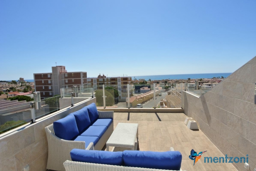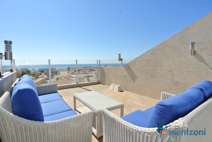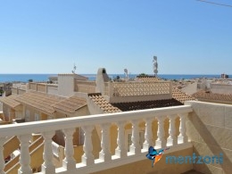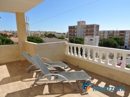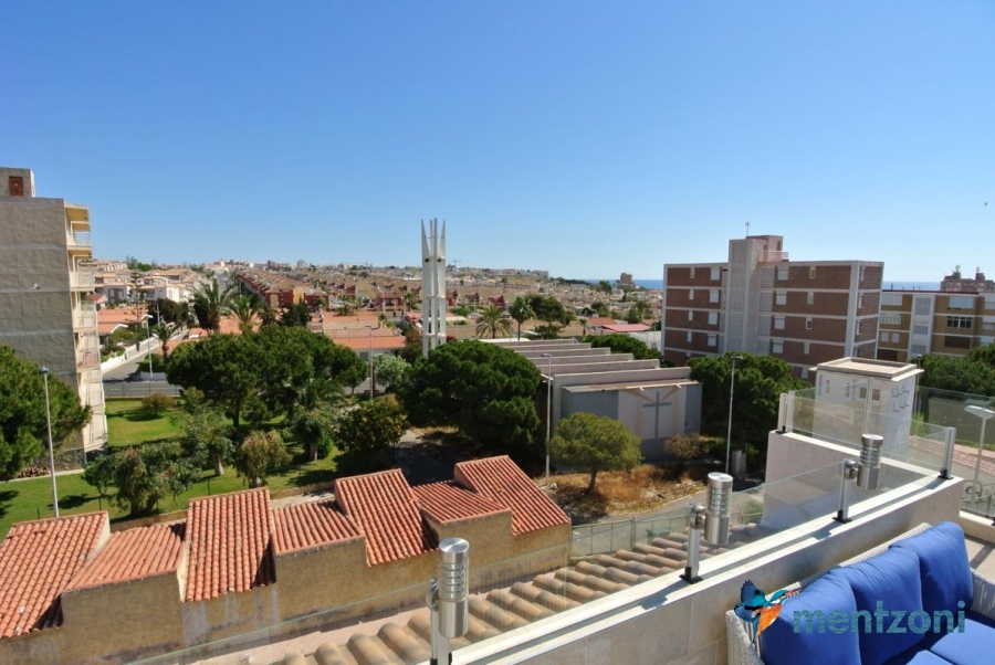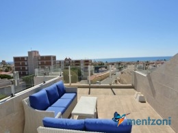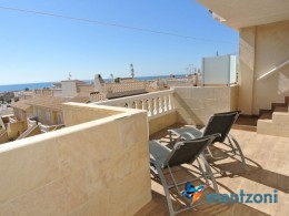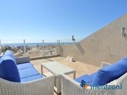 Unique top floor duplex type house with 3 large bedrooms, large living room, separate kitchen, 2 bathrooms, 3 terraces and the magnificent solarium of about 20 m2 with beautiful sea views. Apartment in excellent condition with some refurbishment inside and on the terrace and solarium. Outdoor kitchen also on the roofterrace. Residential with communal pool with amenities very close and the beach less than 350m away.
