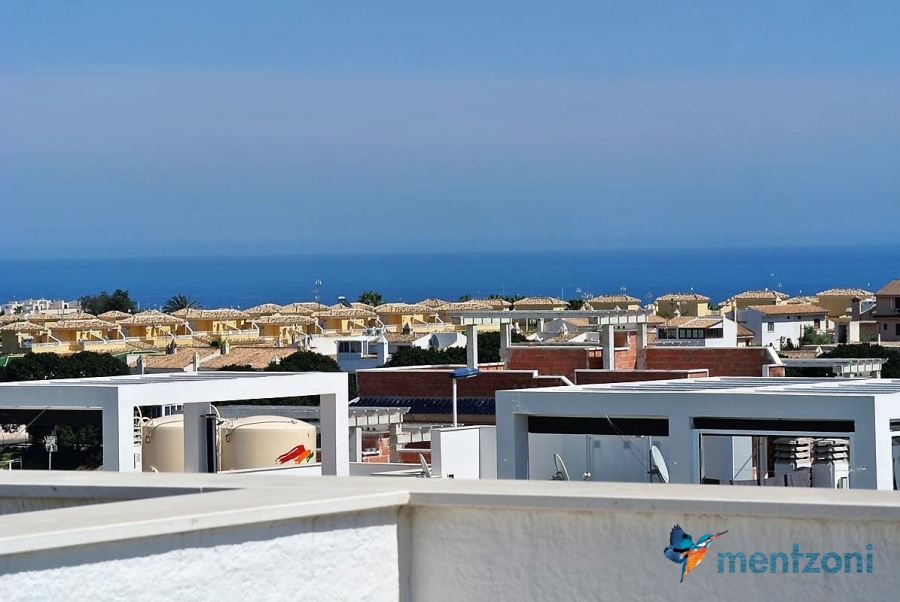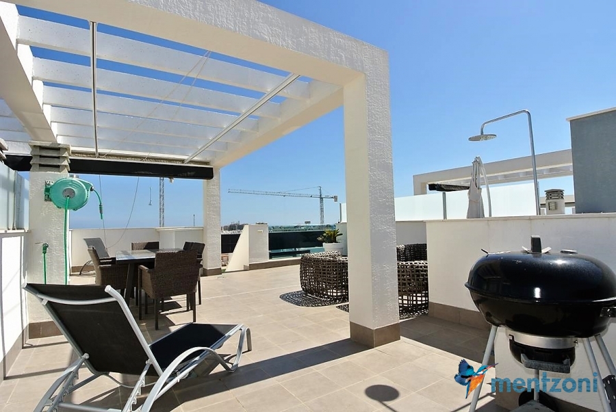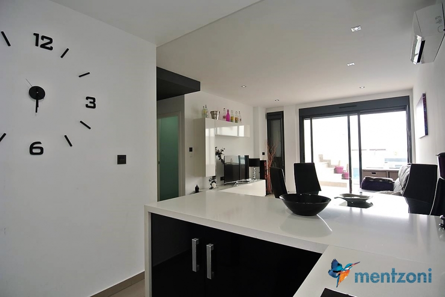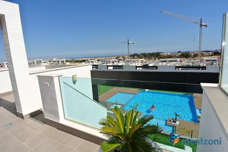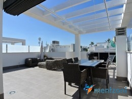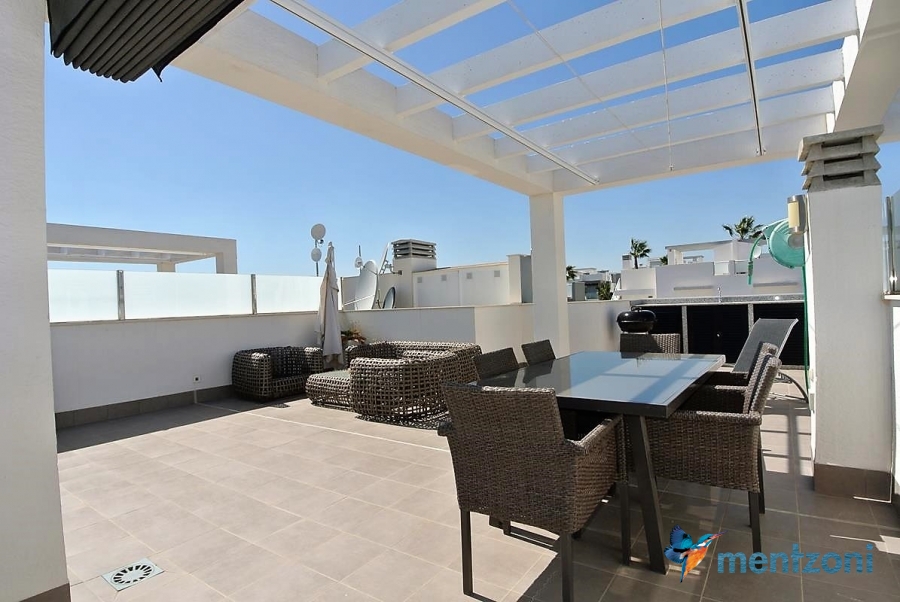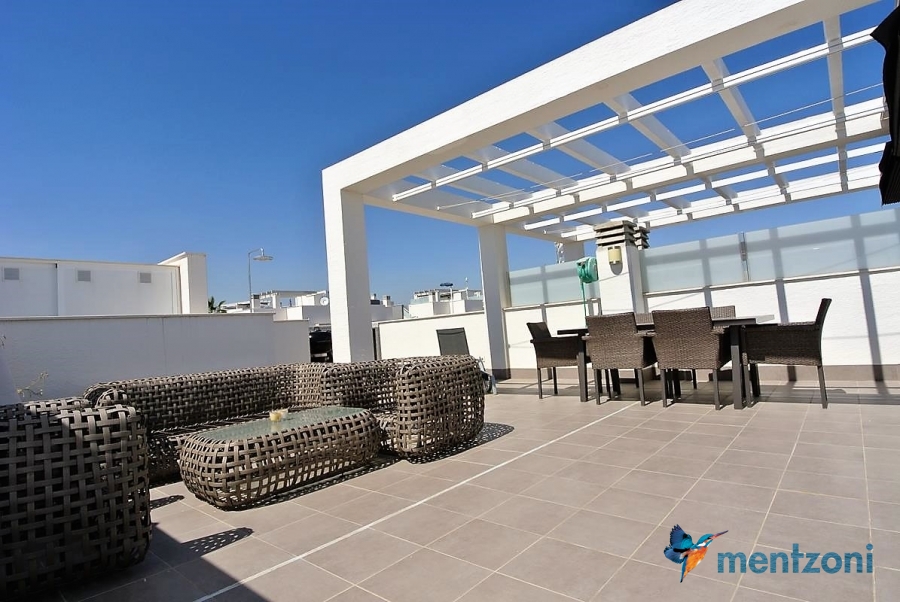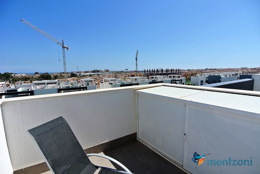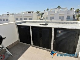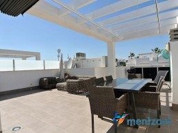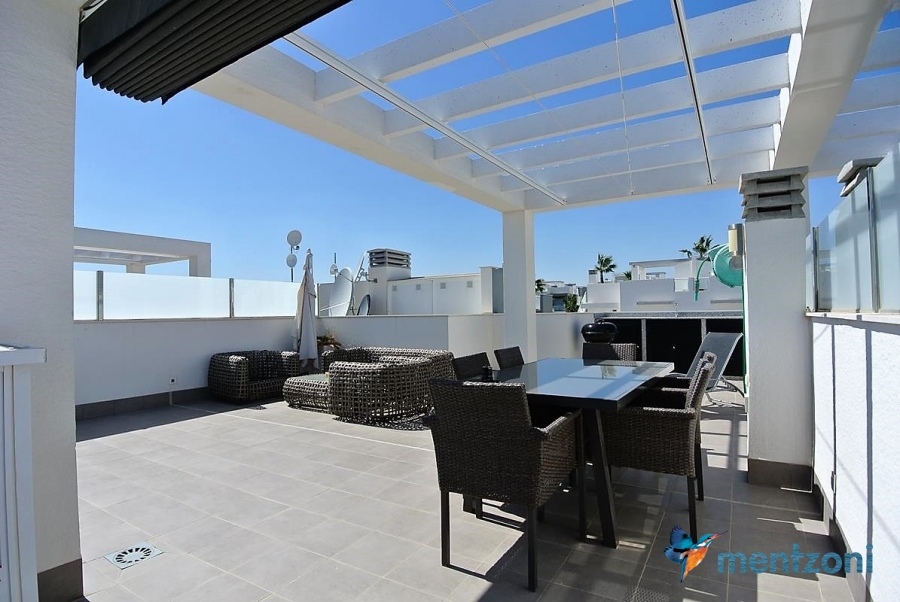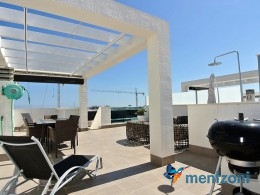Fantastic top floor bungalow with 2 bedroom, 2 bathrooms( 1 en suite), large living room, kitchen, terrace with storage and a big sunny roof terrace with fantastic views. Apartment in perfect condition. AC in all rooms, underfloor heating in bath and living room. Parking space under the complex. Fantastic communal areas and large swimmingpool