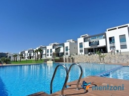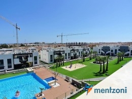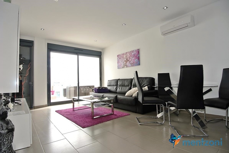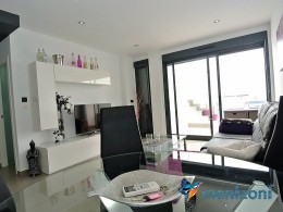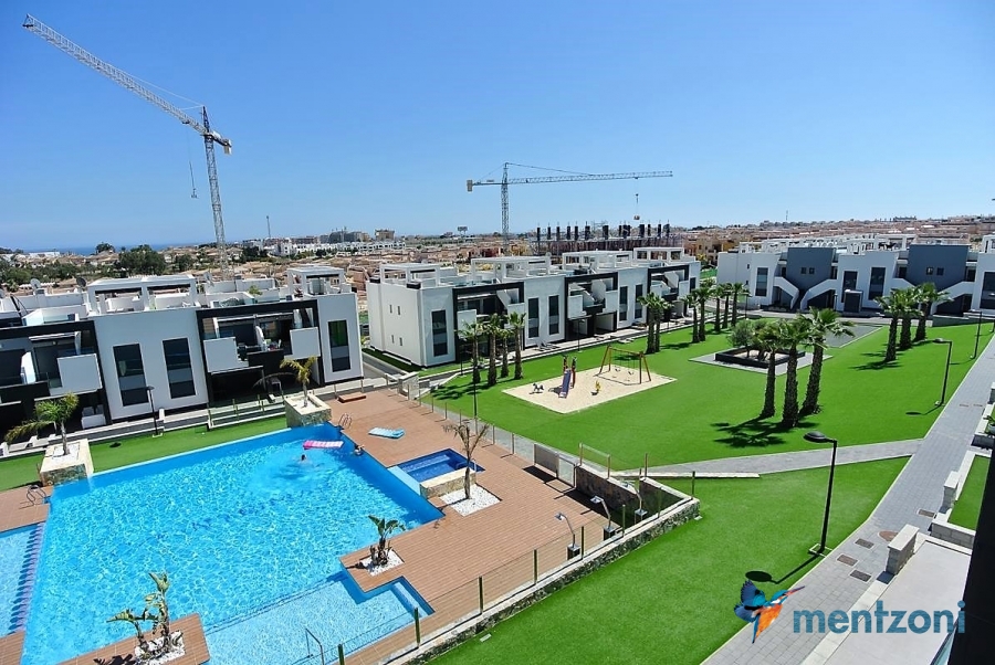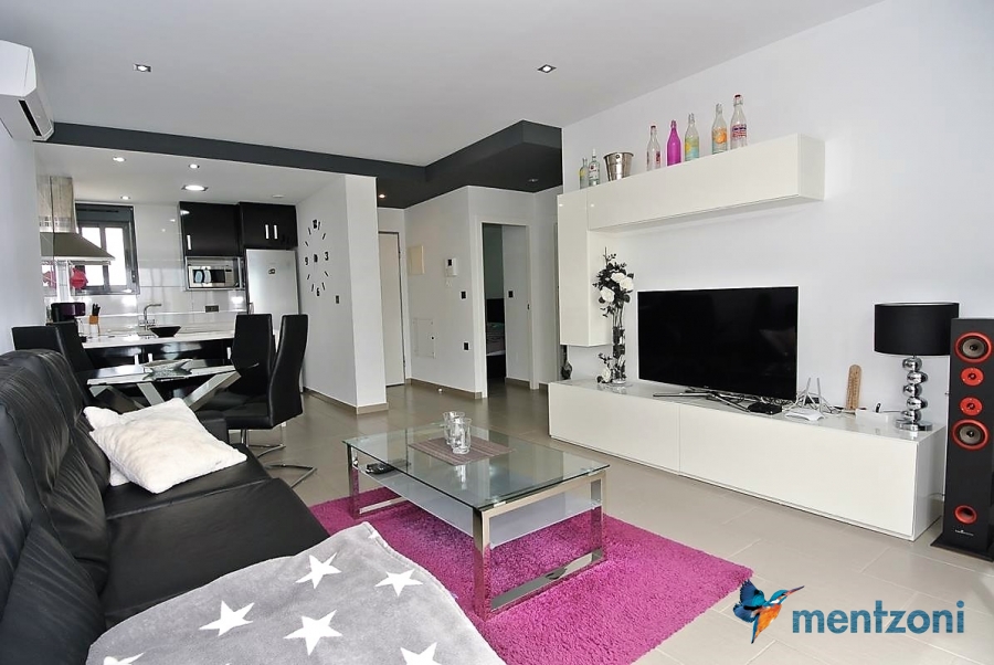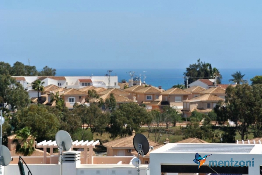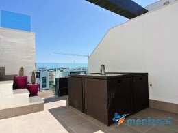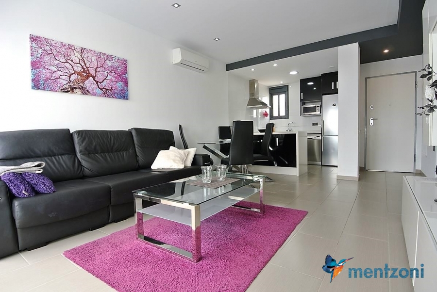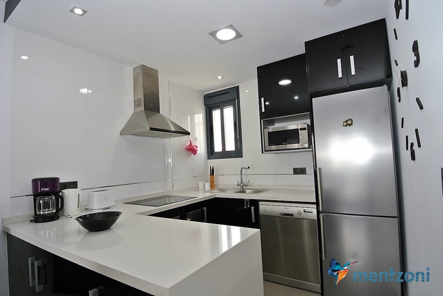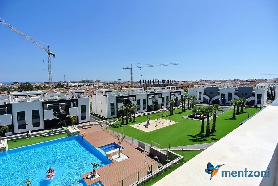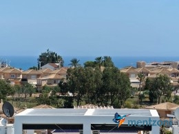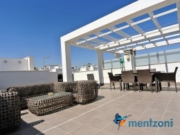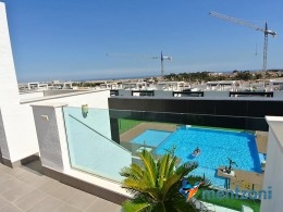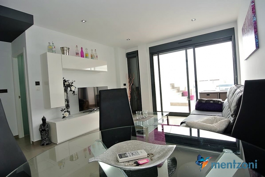 Fantastic top floor bungalow with 2 bedroom, 2 bathrooms( 1 en suite), large living room, kitchen, terrace with storage and a big sunny roof terrace with fantastic views. Apartment in perfect condition. AC in all rooms, underfloor heating in bath and living room. Parking space under the complex. Fantastic communal areas and large swimmingpool