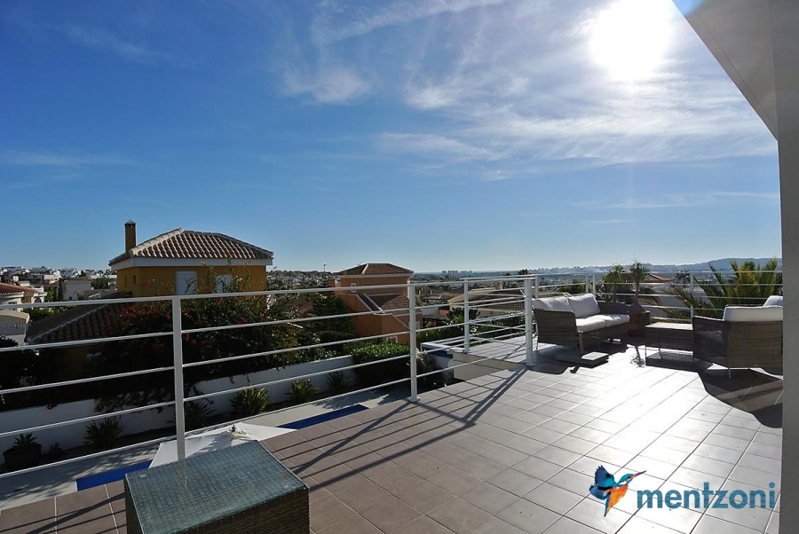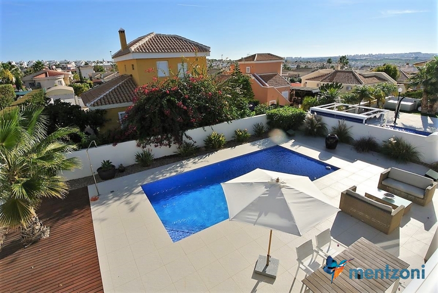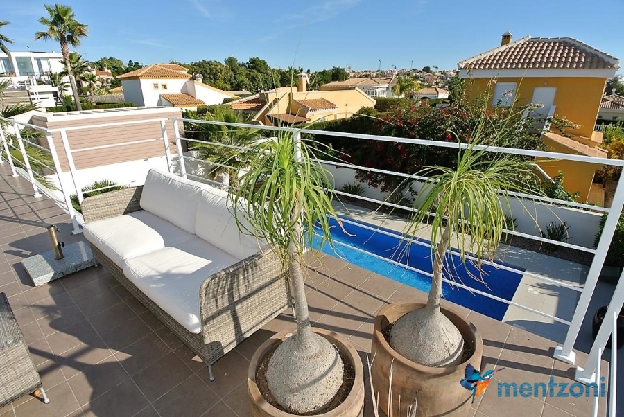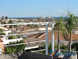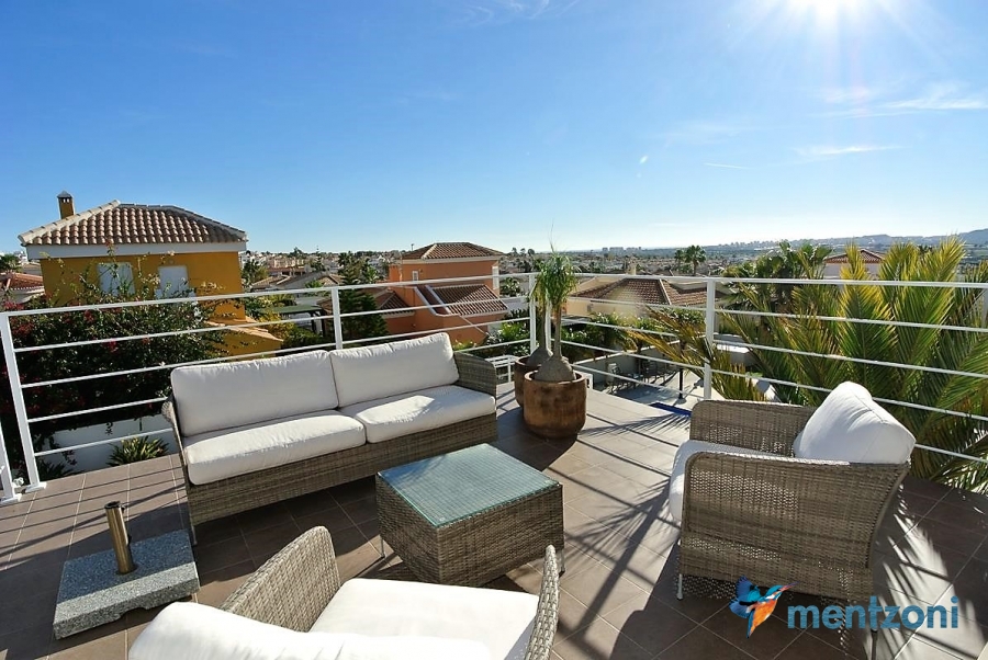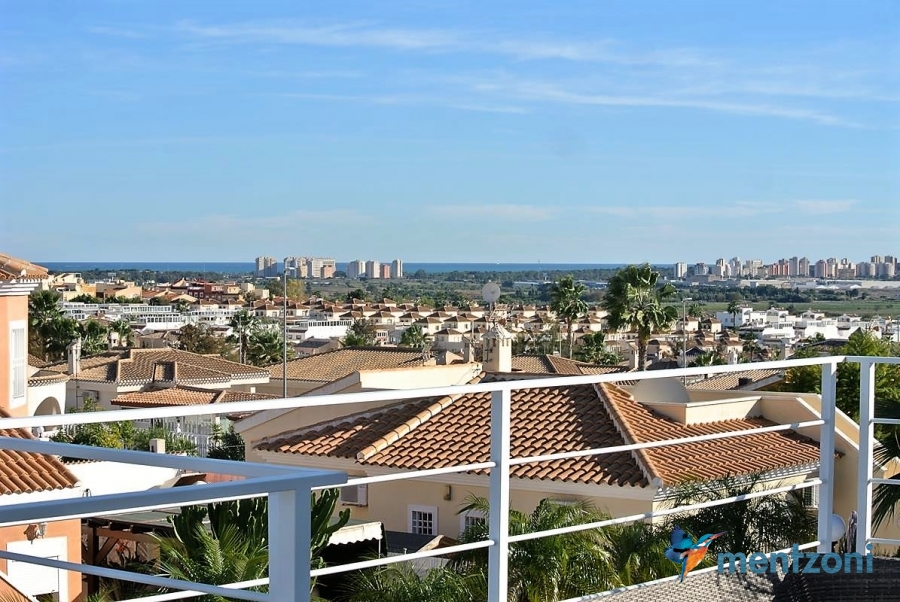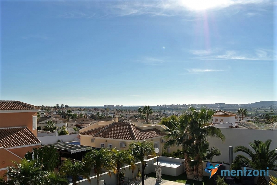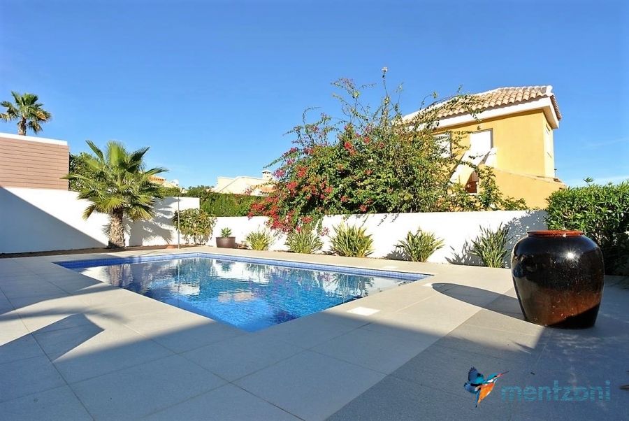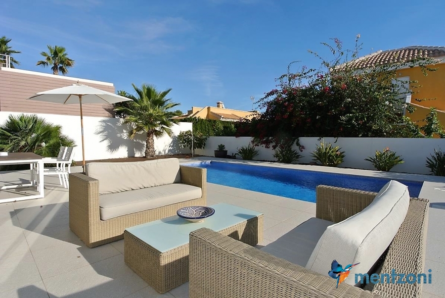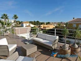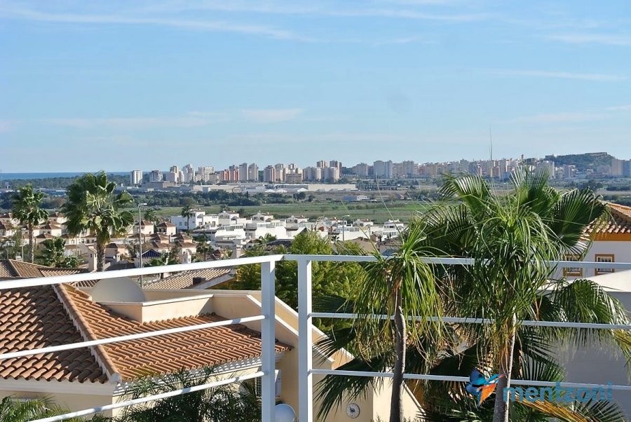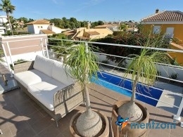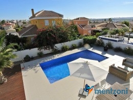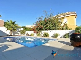 A beautiful villa on 2 floors located in the nice urb. La Marina. This house is built on 500 m2 landscaped plot. Here you have your own private oasis with a 32 m2 pool with chill out zones and sun beds around. On the backside of the house facing the street you have a nice tiled space to enjoy the evening sun in your favourite chair with a good book and something refreshing in the glass surrounded with a very nice Olive tree and plants- heavenly!!