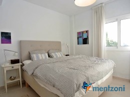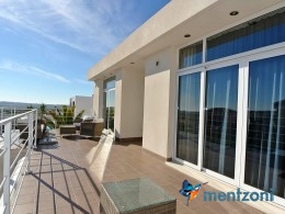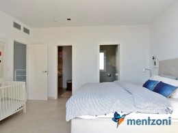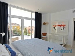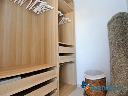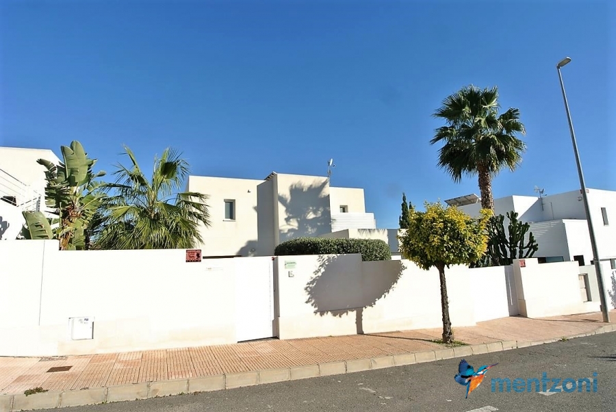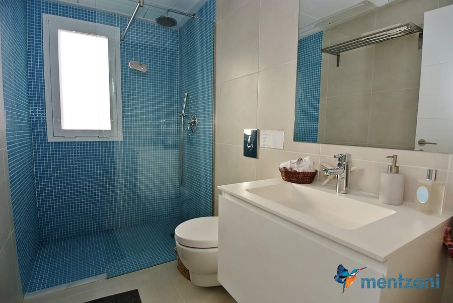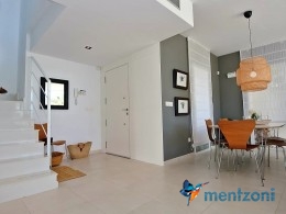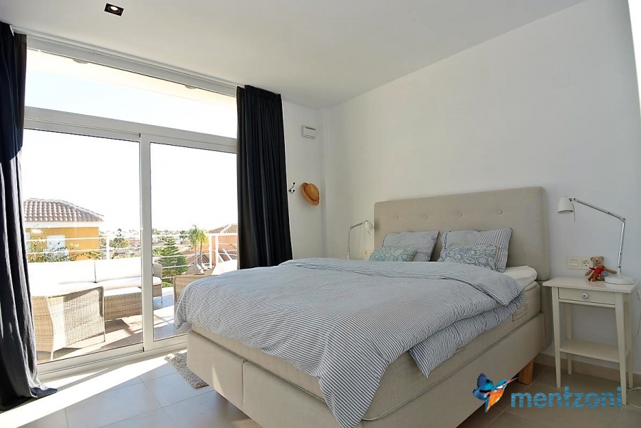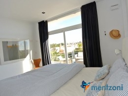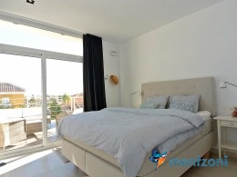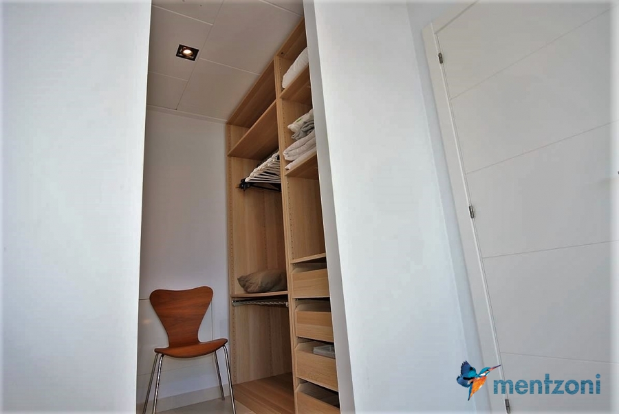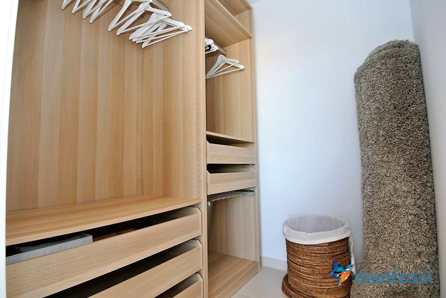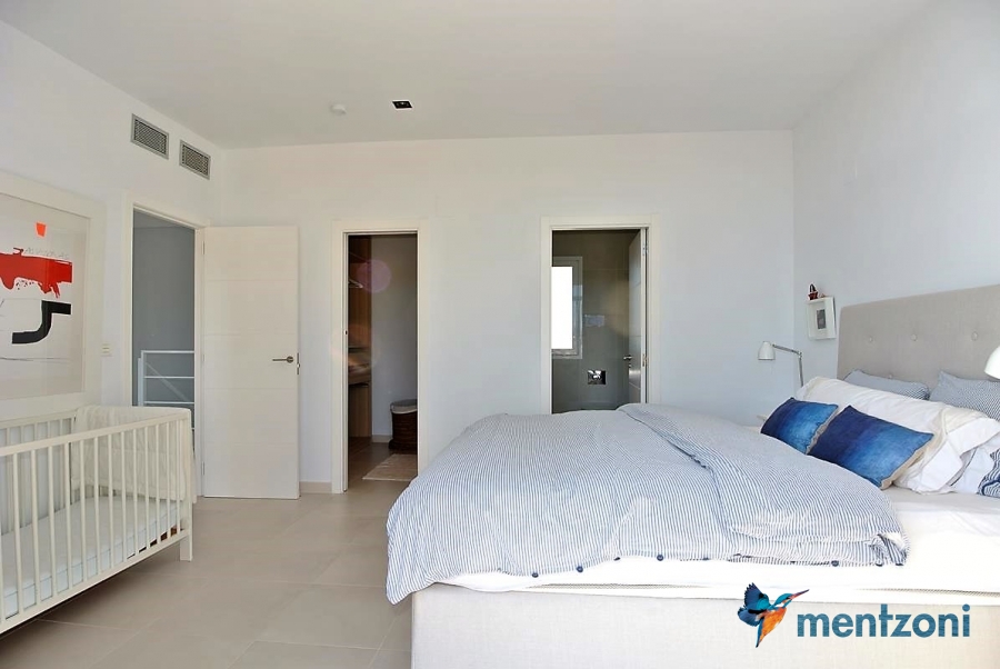 The living room and the open concept kitchen layout is spacious and light due to the floor to ceiling sliding doors that can open the whole facade to the fantastic garden in front. Here you also have a guest bedroom and bathroom and last but not least a big garage with direct access to the house. On the first floor you have 2 big bedrooms en suite with wardrobes and walk in. Both rooms has direct access to a spacious 28 m2 terrace with views to the sea and Guardamar. There is also a small hall with own access to the same terrace. There is underfloor heating through out the whole house and AC in all rooms with a solarpanel system that produce a small amout of energy to use for LED lights etc.