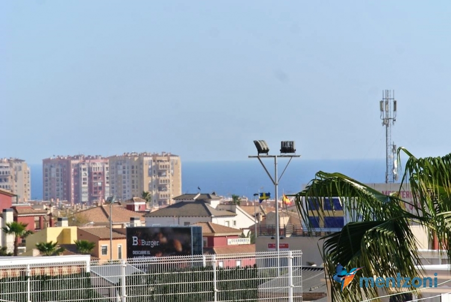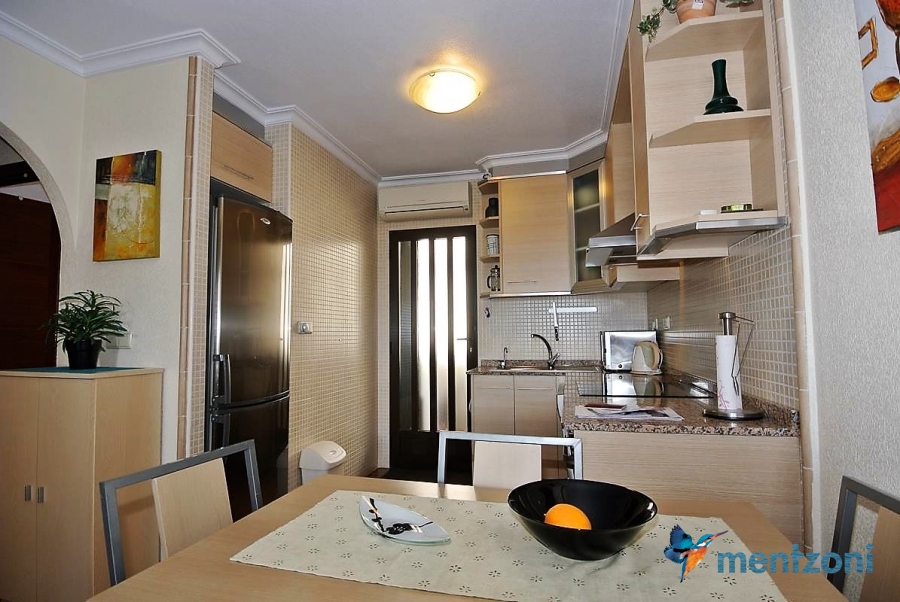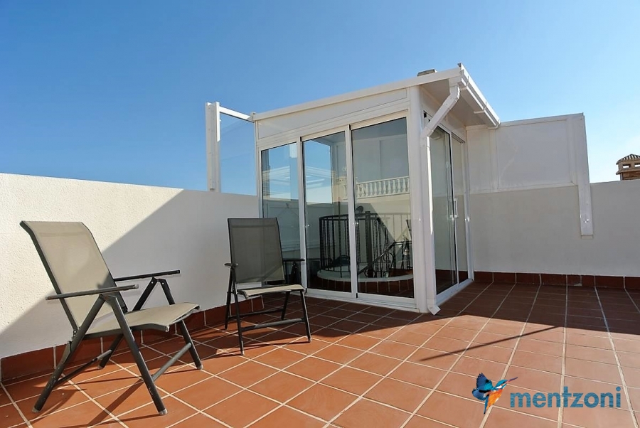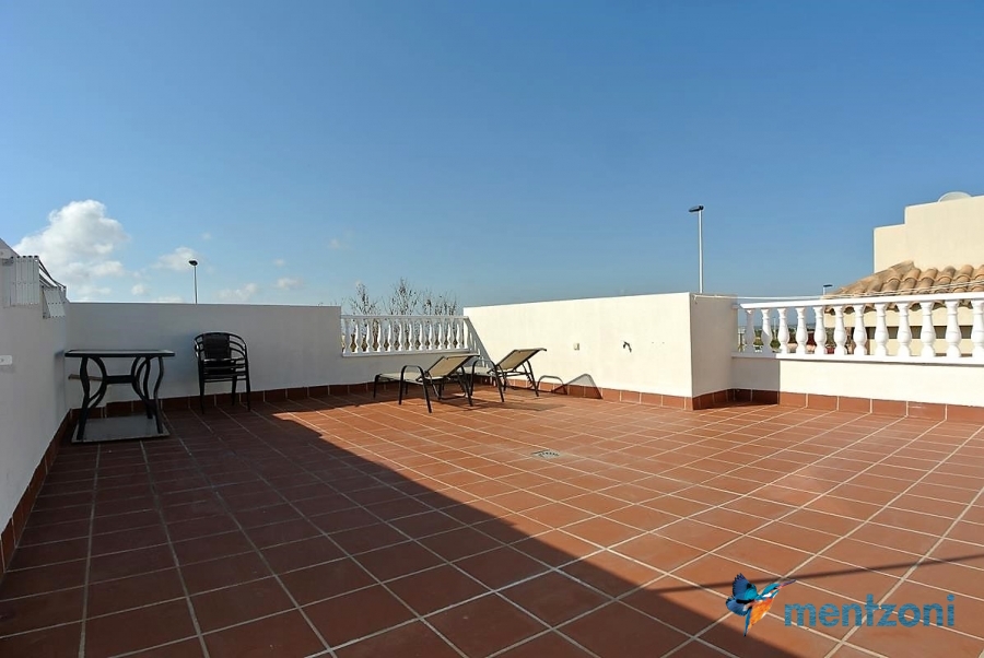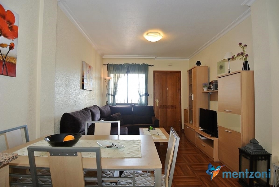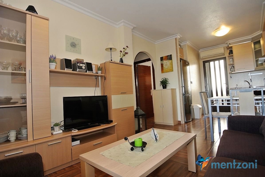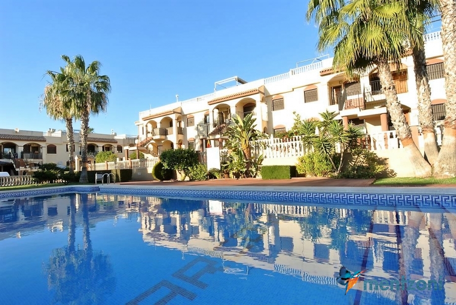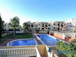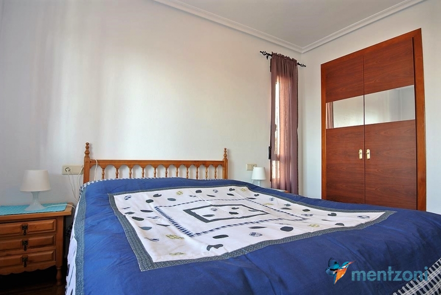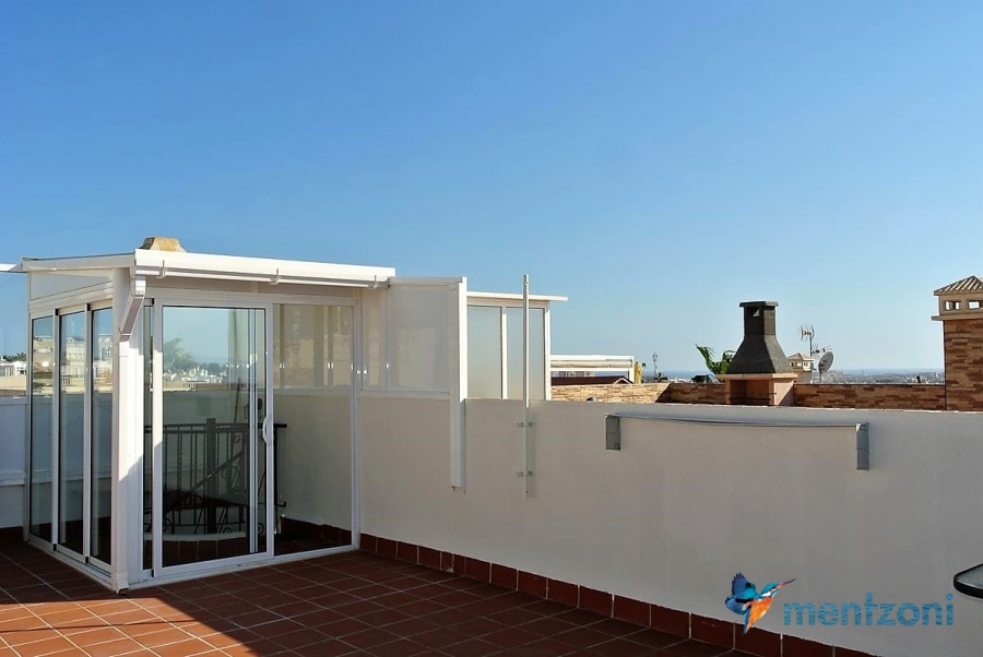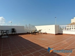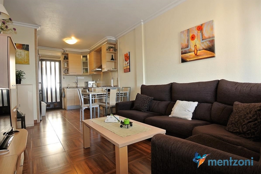 Upstairs apartment with living room/dining room, open kitchen, covered terrace outside living room, 2 bedrooms with built in wardrobes, 1 bathroom, and a big private roof terrace with views. Located inside the fantastic res complex Arcos Mediterráneo with nice communal areas and parking. Walking distance to amenities and the beach only 5 min away with car. AC, funrished. In very nice condition- move in ready.