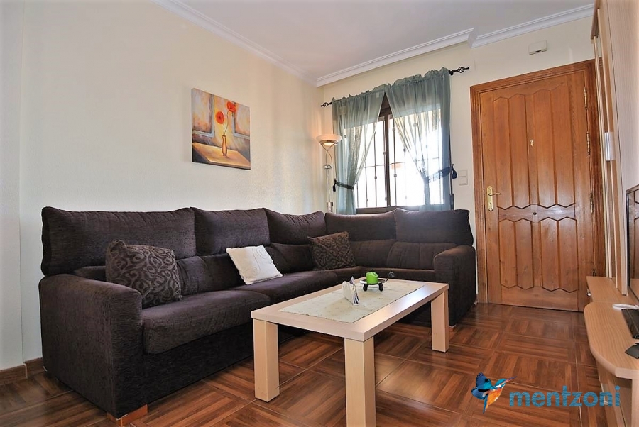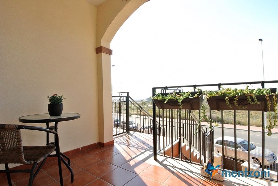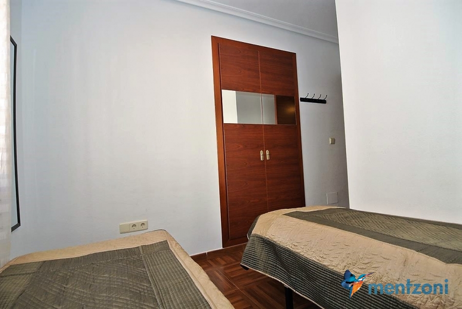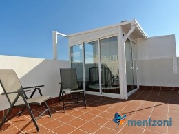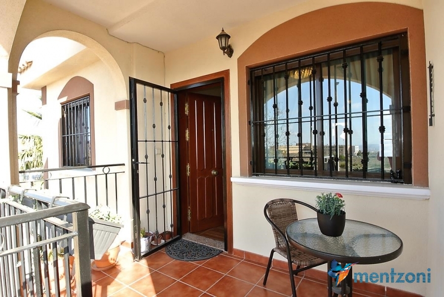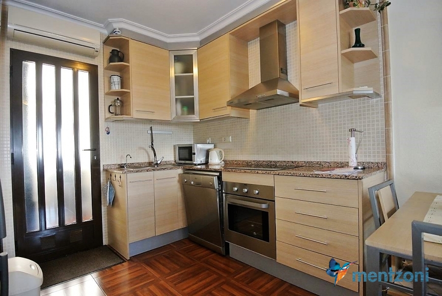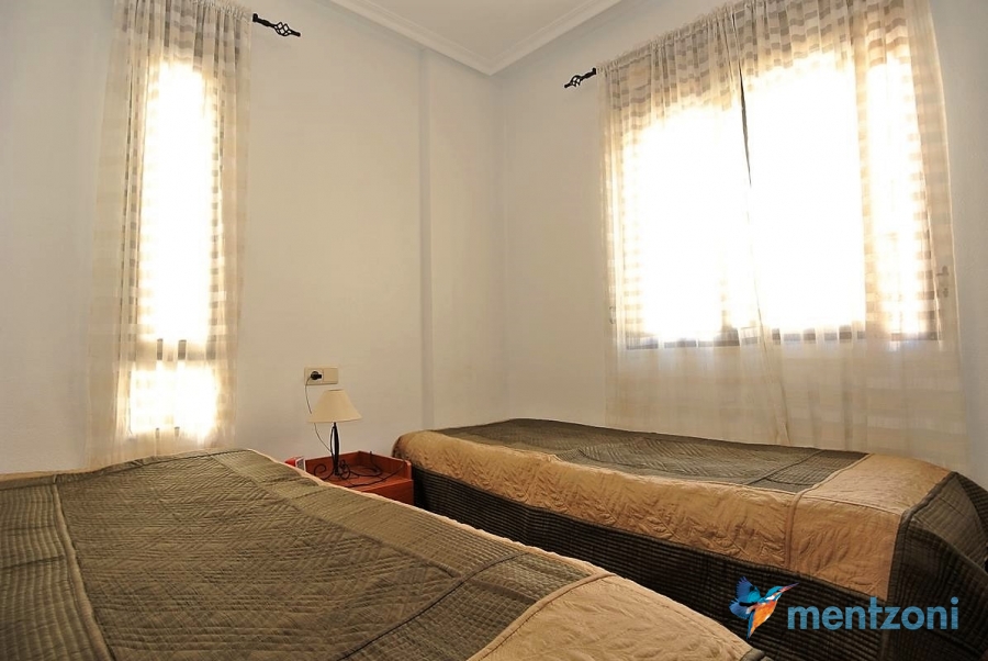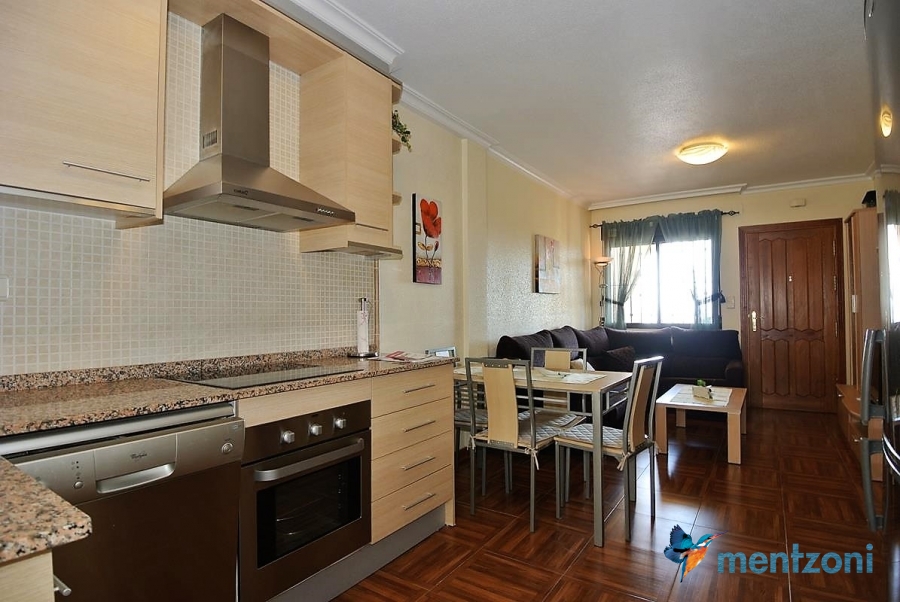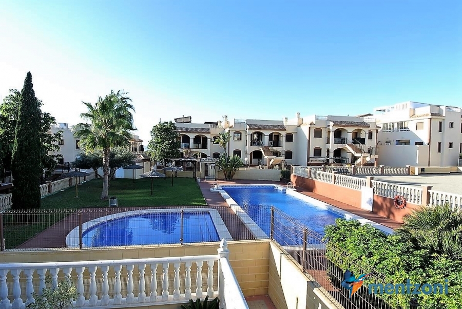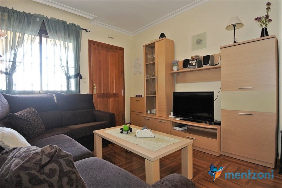 Upstairs apartment with living room/dining room, open kitchen, covered terrace outside living room, 2 bedrooms with built in wardrobes, 1 bathroom, and a big private roof terrace with views. Located inside the fantastic res complex Arcos Mediterráneo with nice communal areas and parking. Walking distance to amenities and the beach only 5 min away with car. AC, funrished. In very nice condition- move in ready.