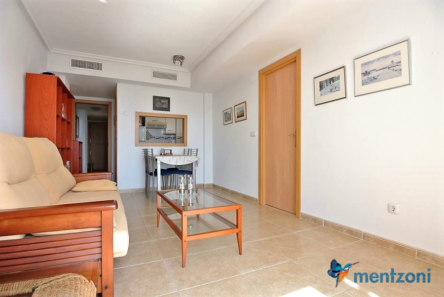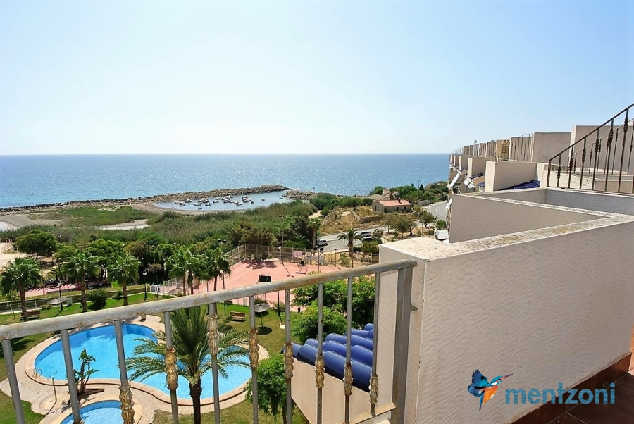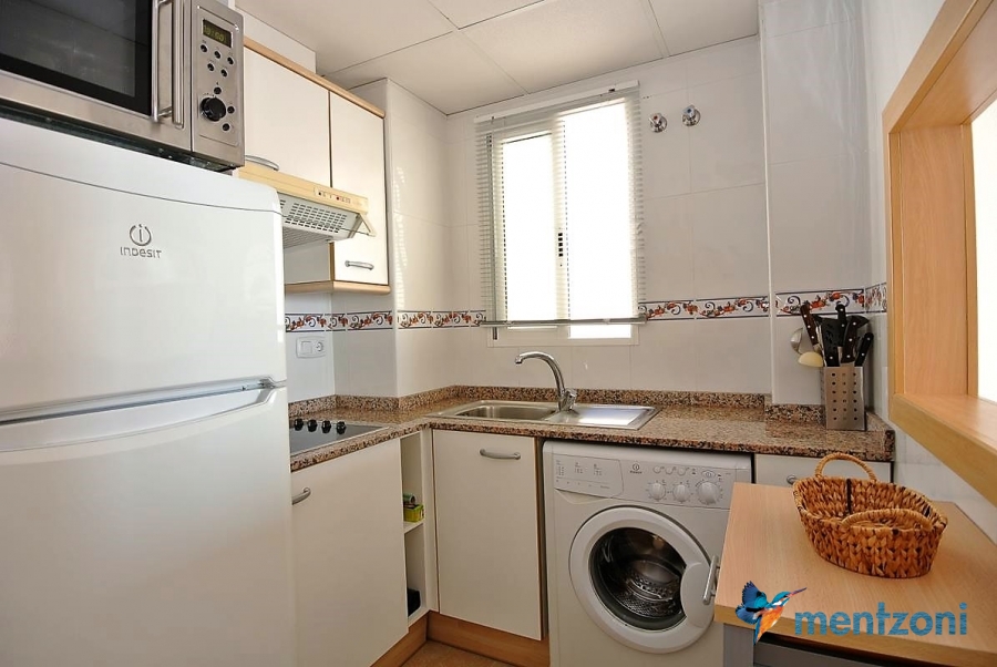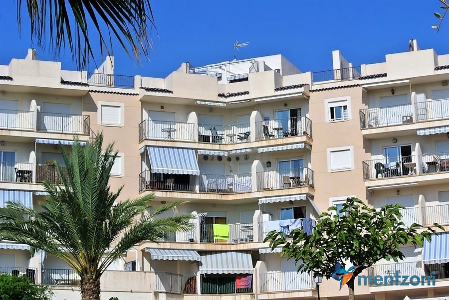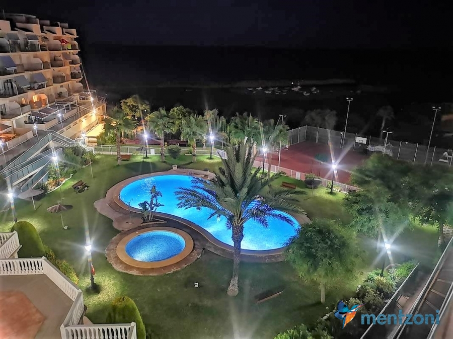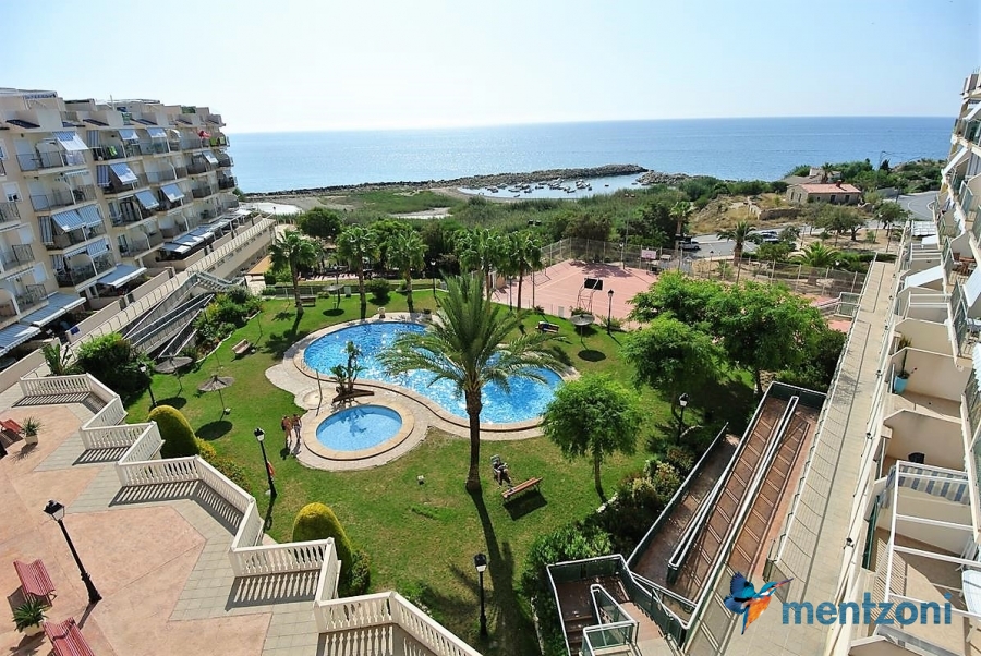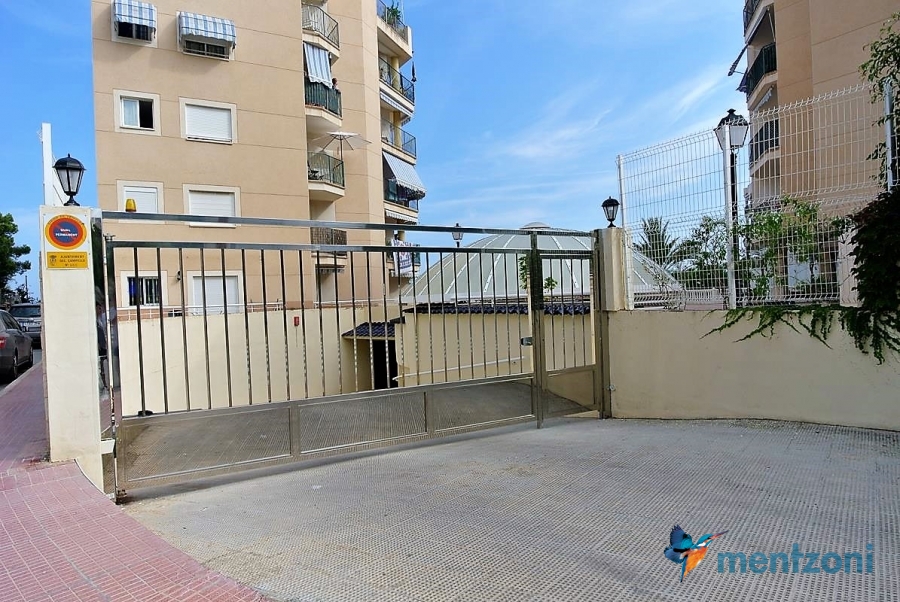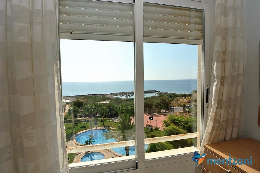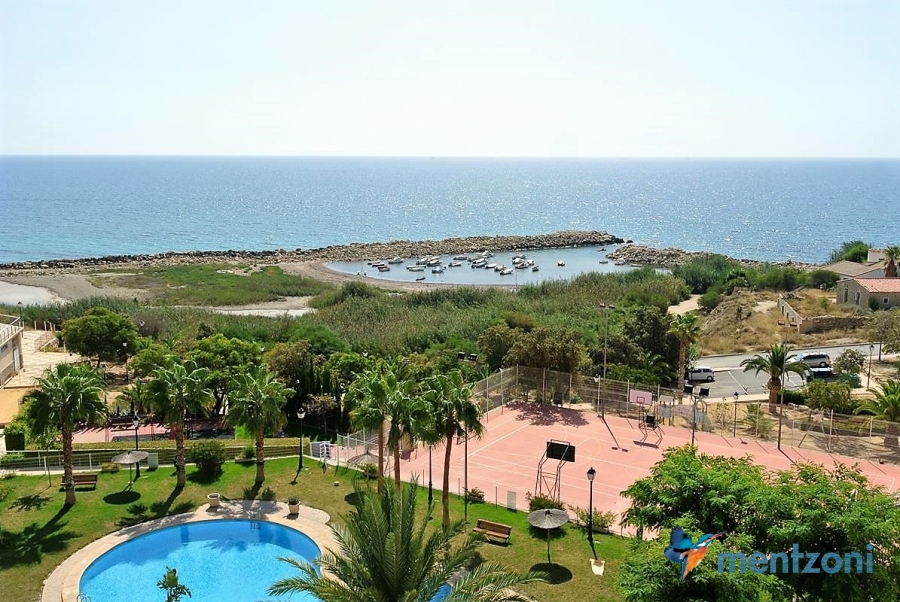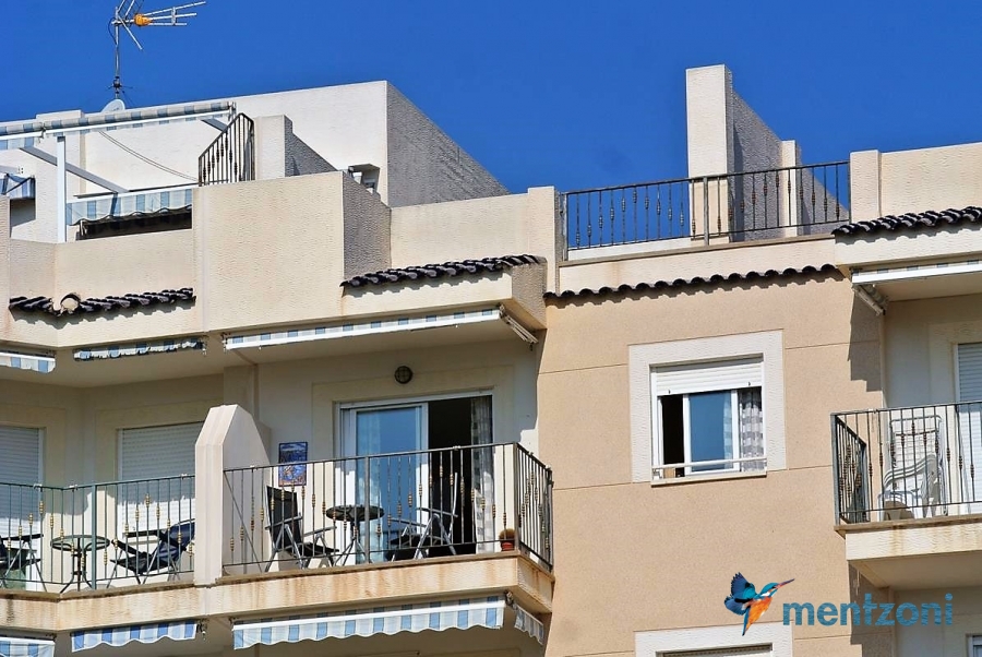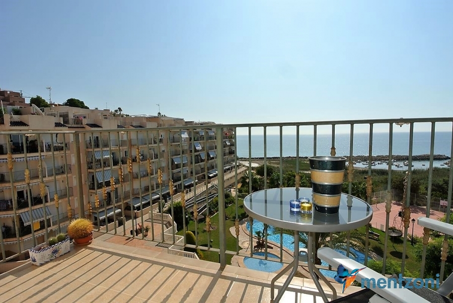Fantastic property- top floor apartment with private roof terrace with panoramic views to the Mediterranean. Consists of 2 bedrooms, 1 bathroom, living room, kitchen and a balcony with excellent views to the complex and sea. This complex is located in first line, with fantastic communal green areas with salt water filtered pool, fitnes/gym, fotball, tennis, and basket and a small marina and private beach called- Venta Lanuza. walking distance to amenities, bus line and train to Alicante or direction north. Benidorm is just a few minutes away.