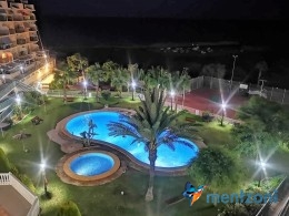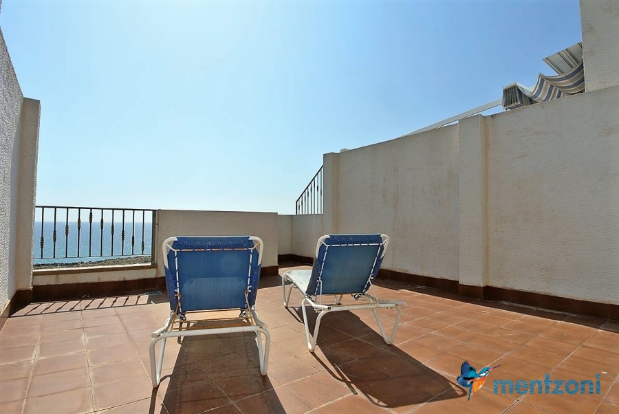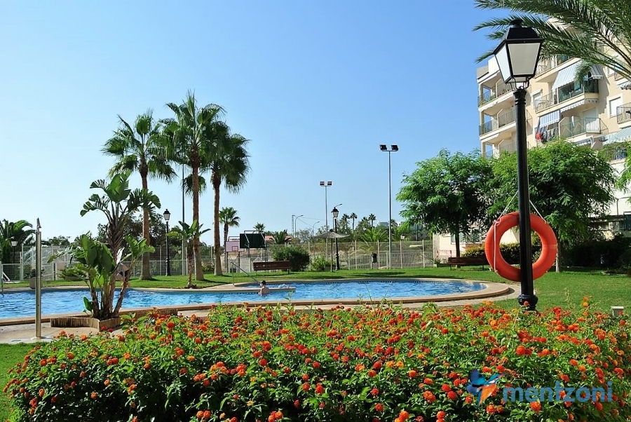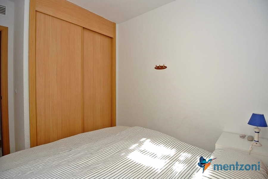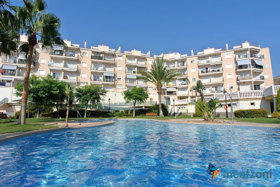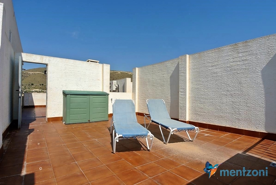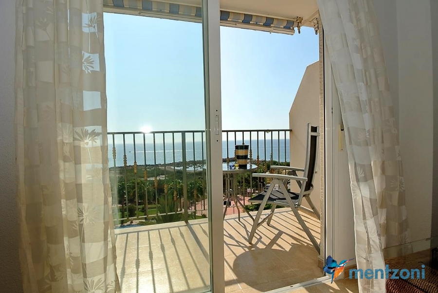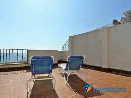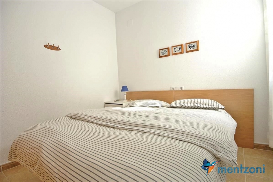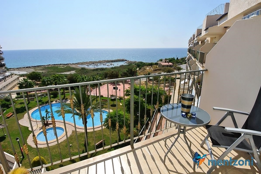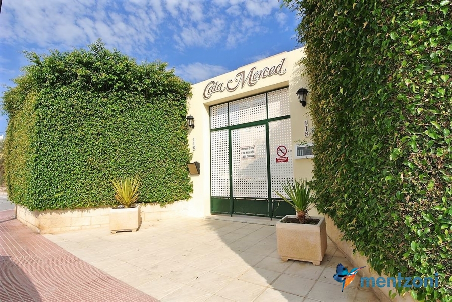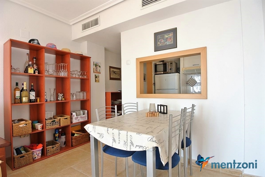Fantastic property- top floor apartment with private roof terrace with panoramic views to the Mediterranean. Consists of 2 bedrooms, 1 bathroom, living room, kitchen and a balcony with excellent views to the complex and sea. This complex is located in first line, with fantastic communal green areas with salt water filtered pool, fitnes/gym, fotball, tennis, and basket and a small marina and private beach called- Venta Lanuza. walking distance to amenities, bus line and train to Alicante or direction north. Benidorm is just a few minutes away.