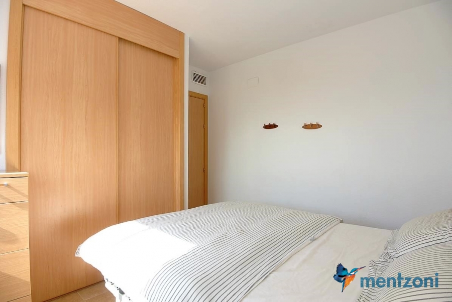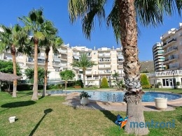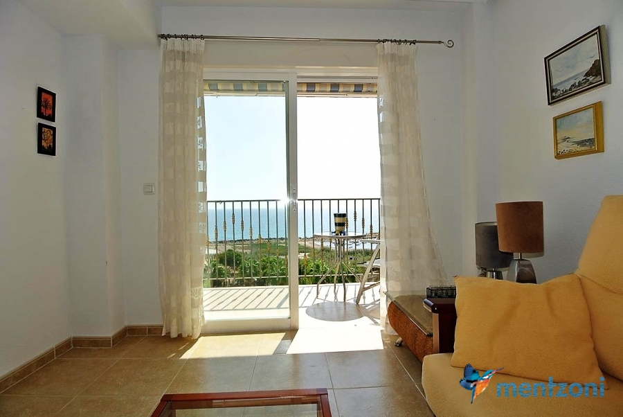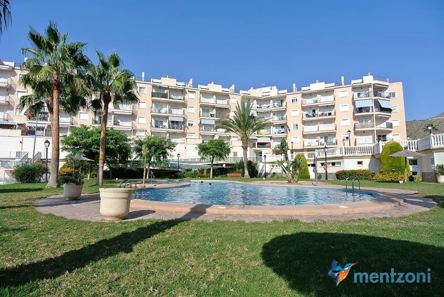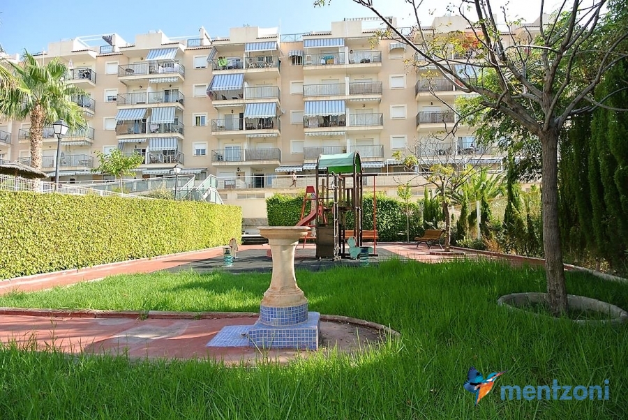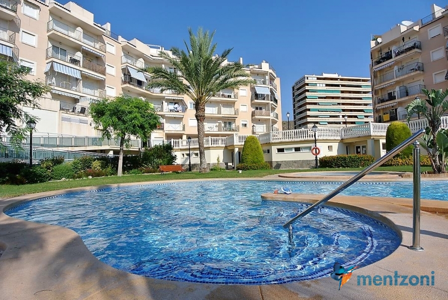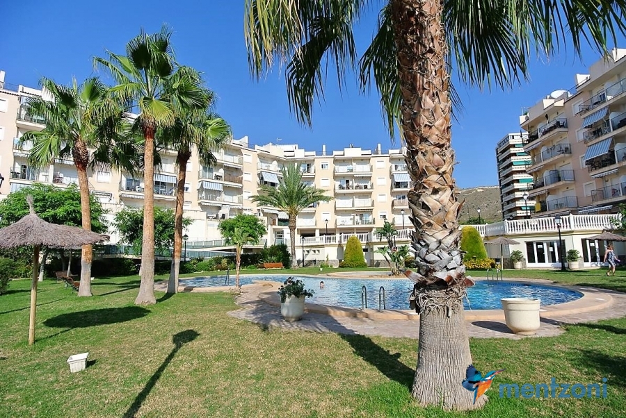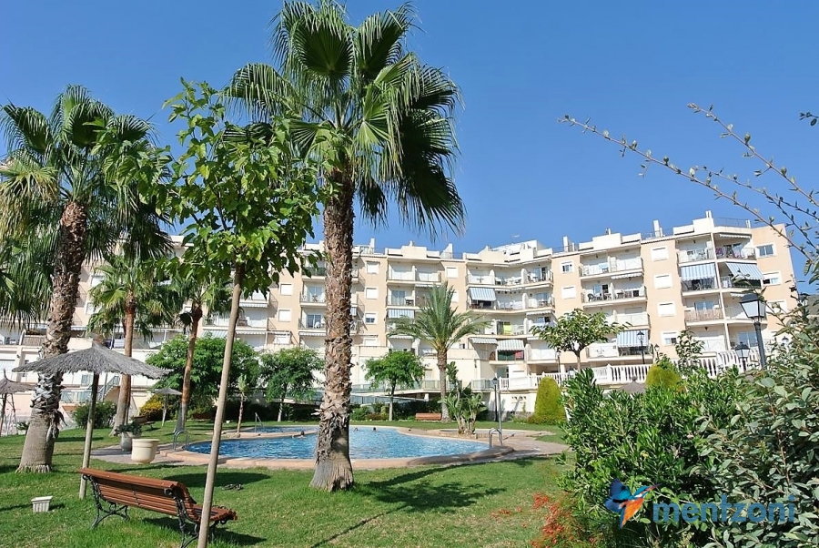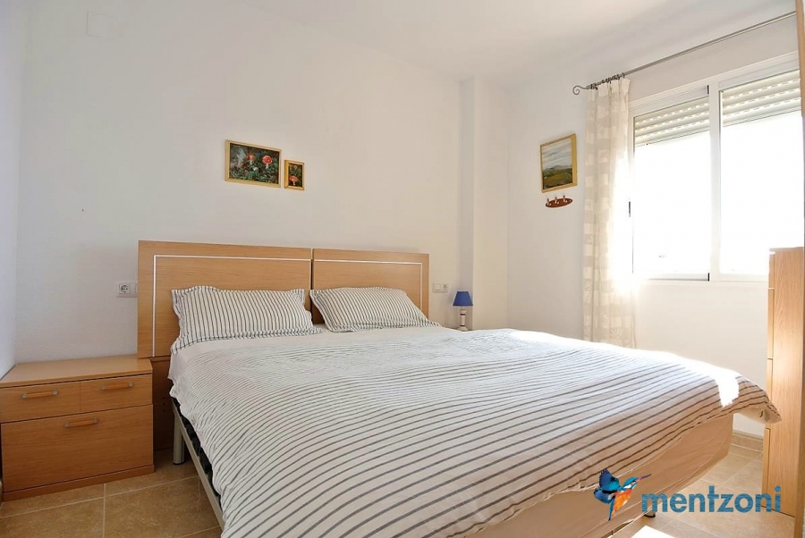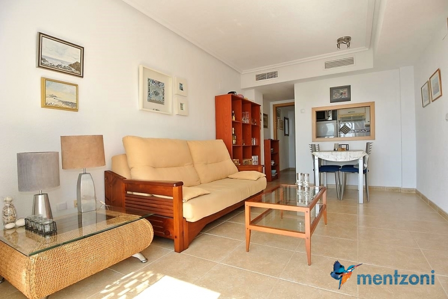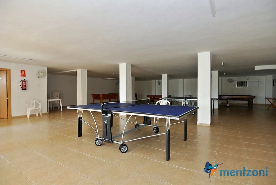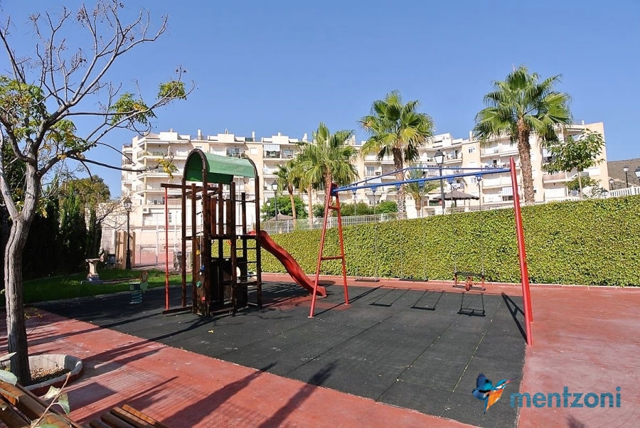 Fantastic property- top floor apartment with private roof terrace with panoramic views to the Mediterranean. Consists of 2 bedrooms, 1 bathroom, living room, kitchen and a balcony with excellent views to the complex and sea. This complex is located in first line, with fantastic communal green areas with salt water filtered pool, fitnes/gym, fotball, tennis, and basket and a small marina and private beach called- Venta Lanuza. walking distance to amenities, bus line and train to Alicante or direction north. Benidorm is just a few minutes away.