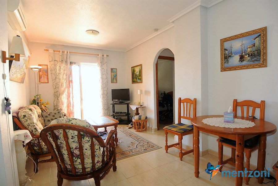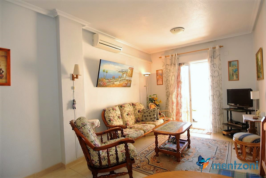 Consists of living room with access to a private terrace with views to the Plaza Calvario in Torrevieja, 2 bedrooms, 1 bathroom, kitchen. Lift, AC, well equipped and furnished. Walking distance to everything