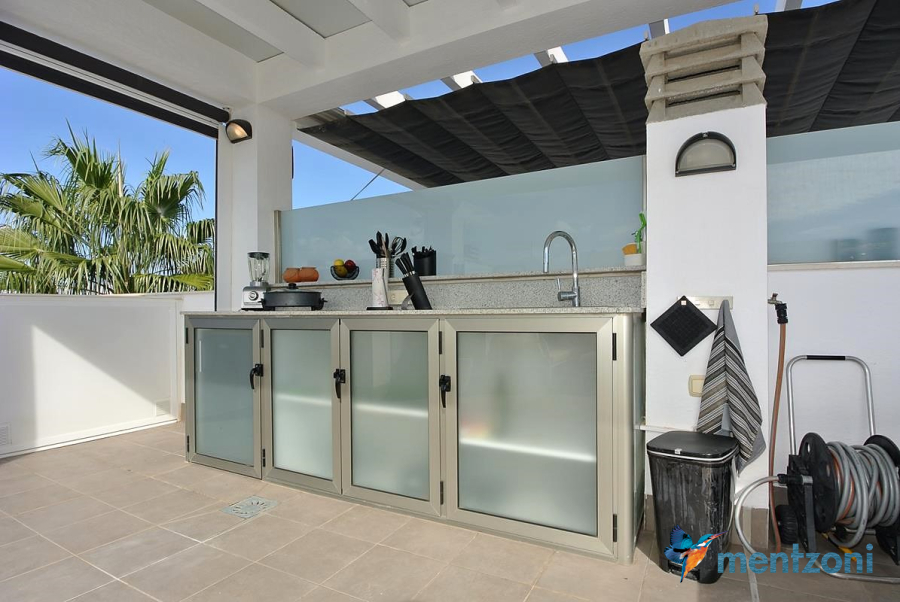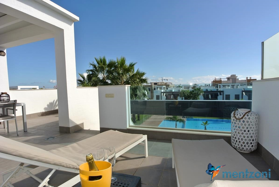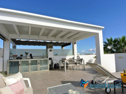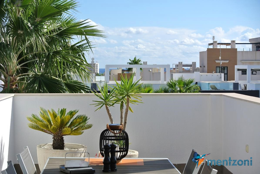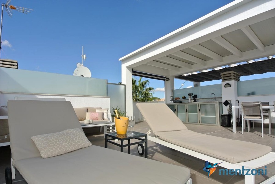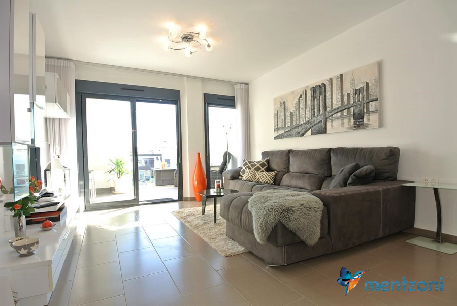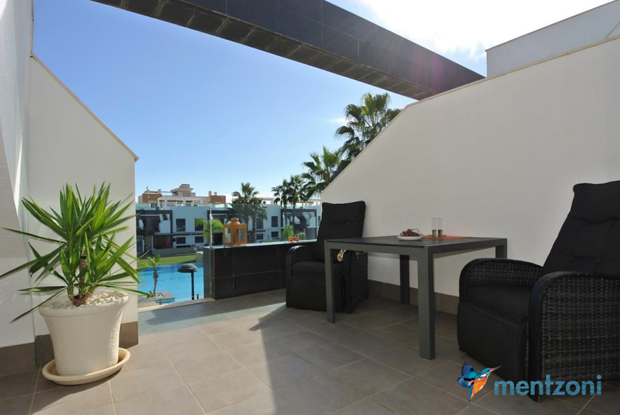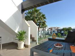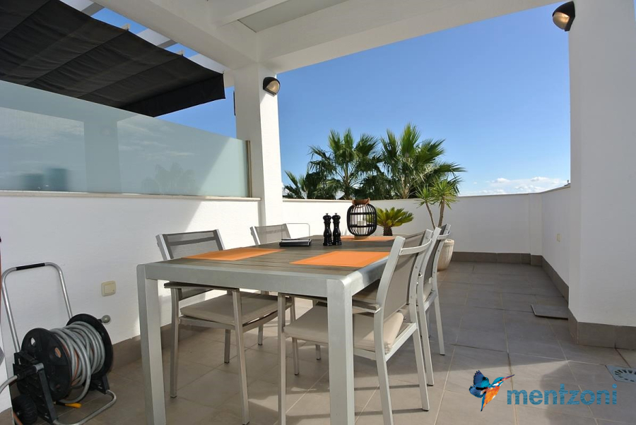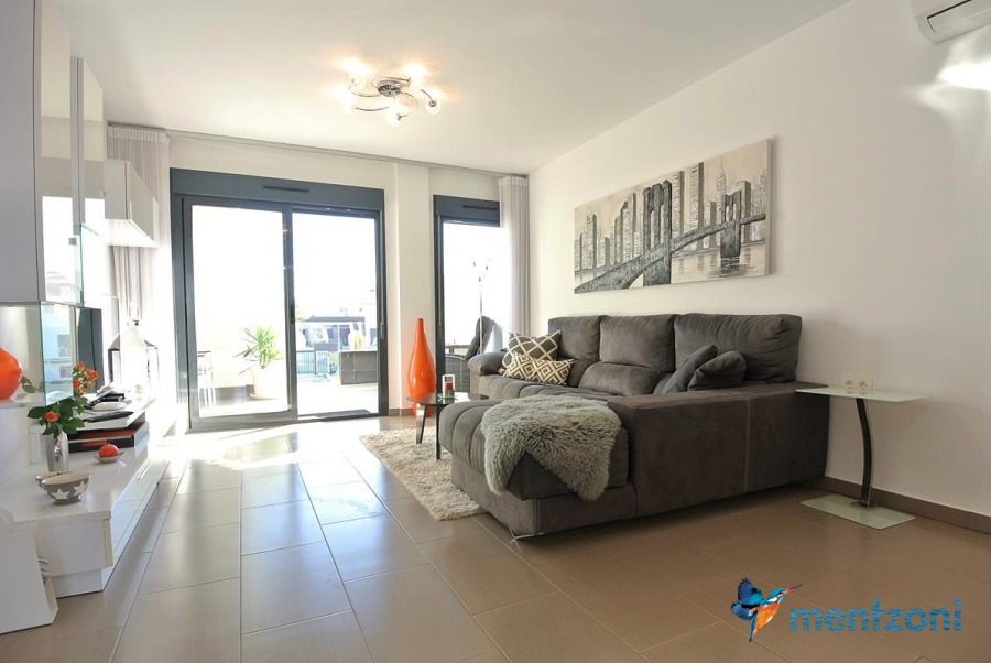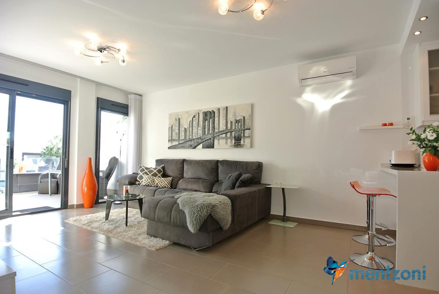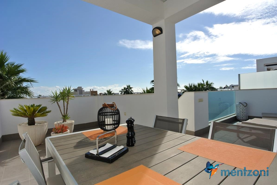 Consists of 2 bedrooms, 2 bathrooms ( 1 en suite), åpen concept kitchen, living room with direct access to a cozy terrace with views to communal areas, from here a staircase up the 55 m2 private roof terrace with sea views, her you have a covered shower, outside kitchen, sitting group, and covered eating area. Underfloor heating and AC in all rooms, upgraded whitegoods (Siemens). A modern apartment in good condition. ocated inside a very nice complex with great children friendly communal ares, Jacuzzi, and parking space in the basement. Located very near the famous CC La Zenia Boulevard. All amenities in walking distance. Beaches nearby.