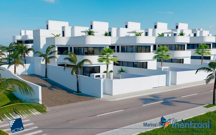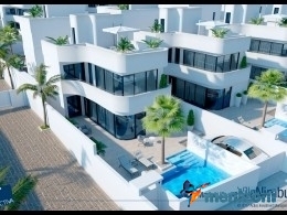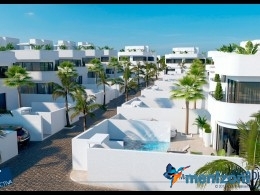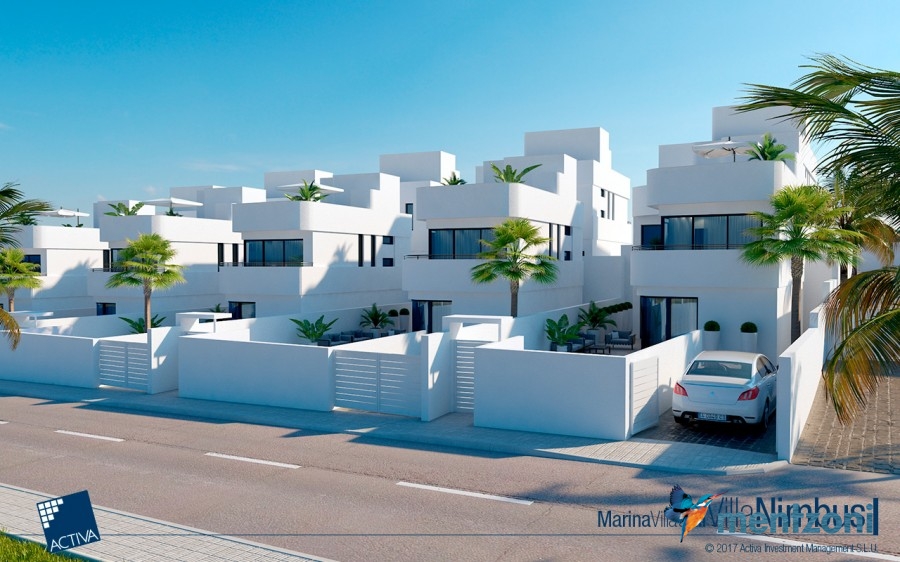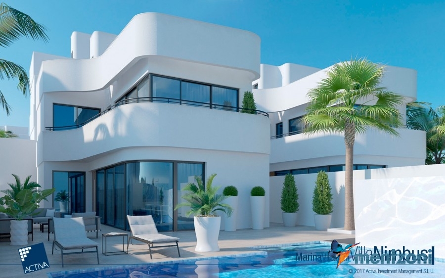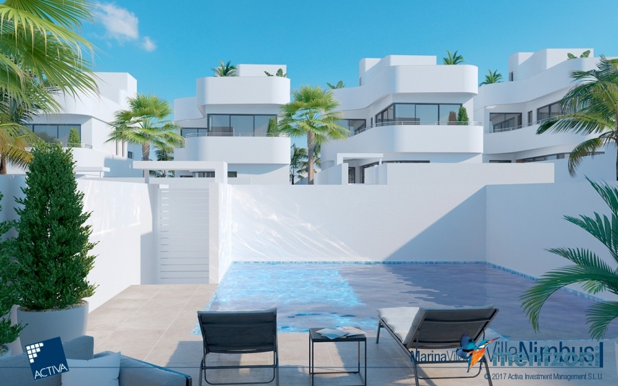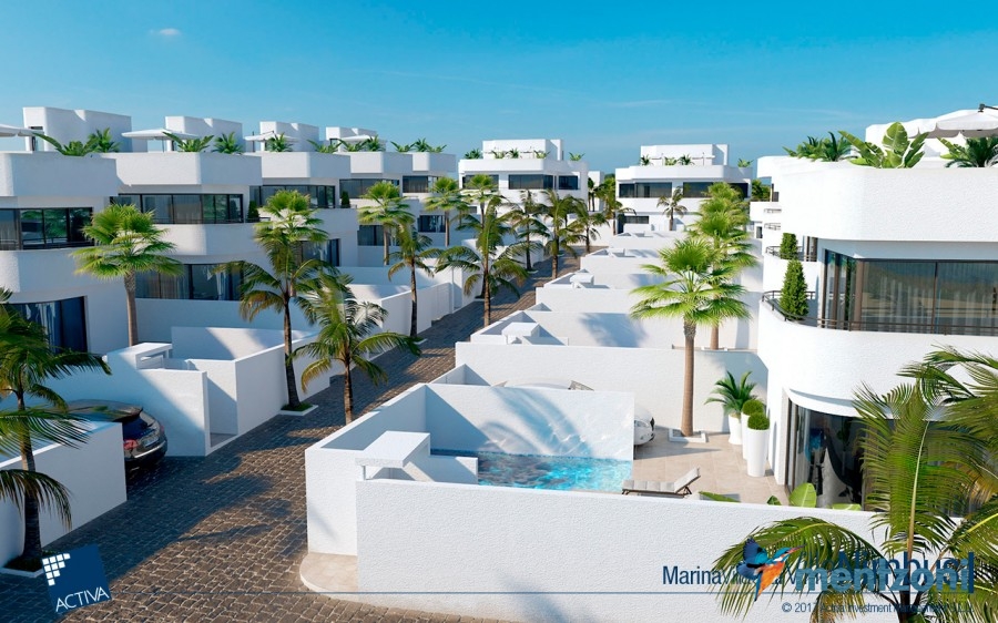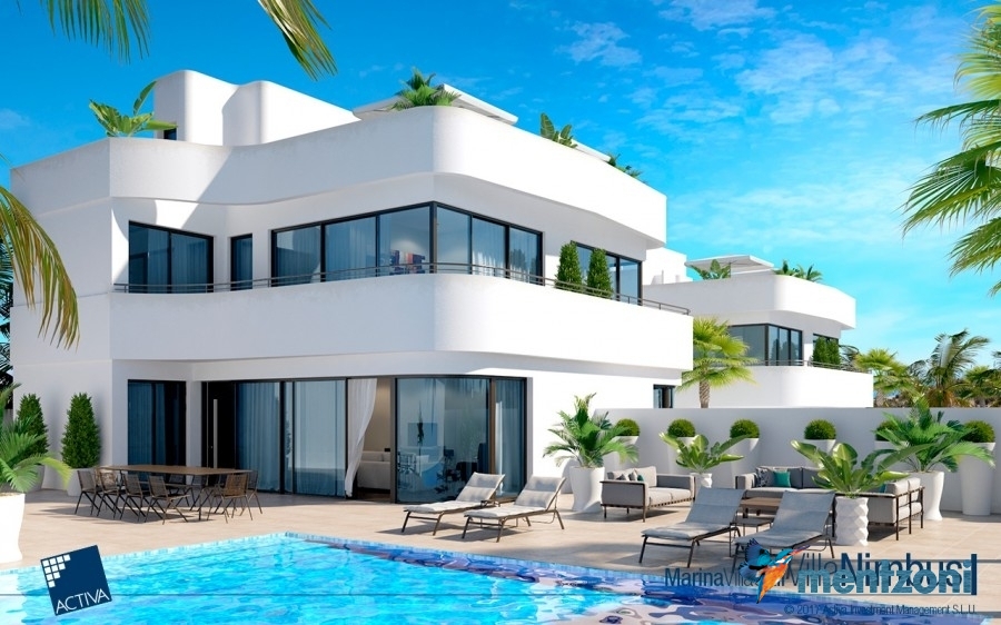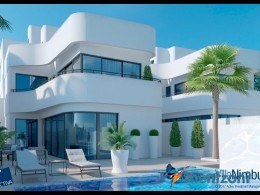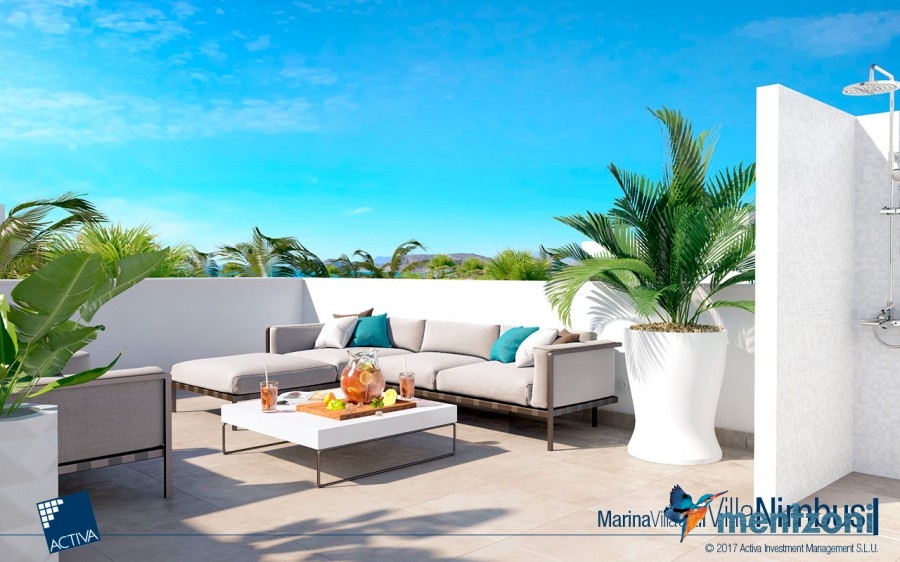 First floor has a guest bedroom with a private terrace of 15 m2. On this floor you also find the master bedroom with private bath and walk in wardrobe. Big sliding windows around the facade of the room out to the terrace. And on top of the house you find a huge solarium of 44 m2 with fantastic views even to the sea.